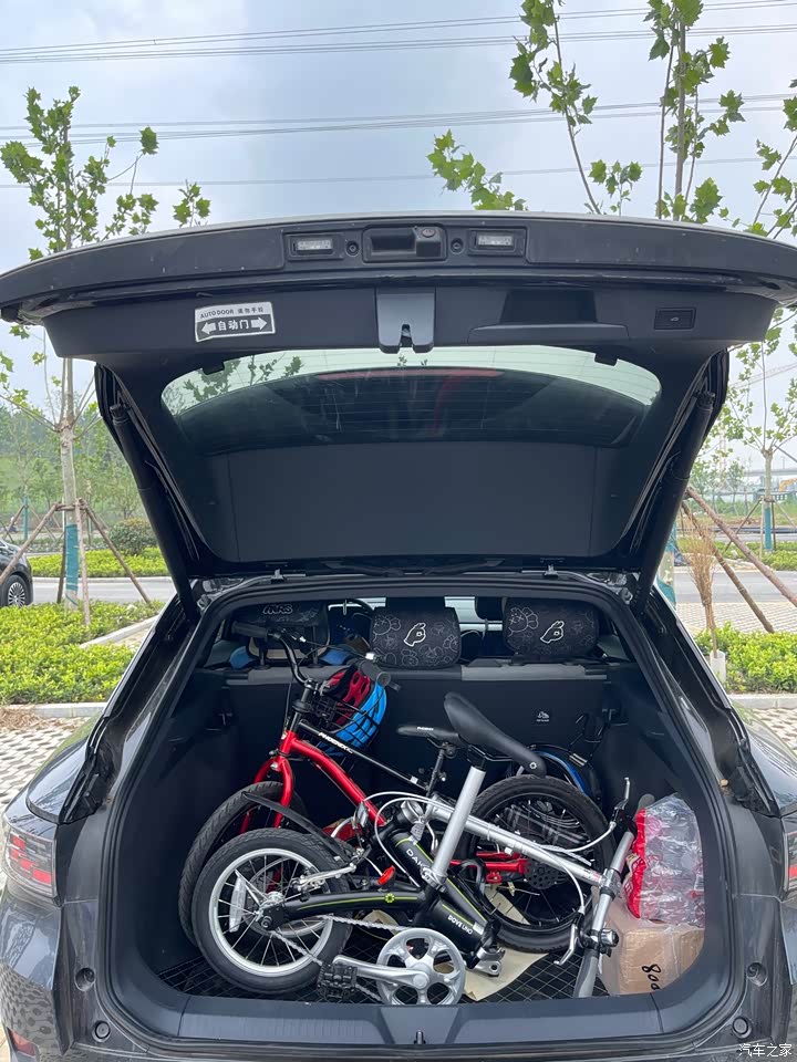 后备箱ID.4 CROZZ后备厢进深是940-1760mm,宽度是1000mm,高度是820mm。这些数据也许听起来没啥概念,我这次出游云南大理,带了一个大行李箱,n多背包都没问题。平日带露营装备,2辆折叠自行车也很轻松。