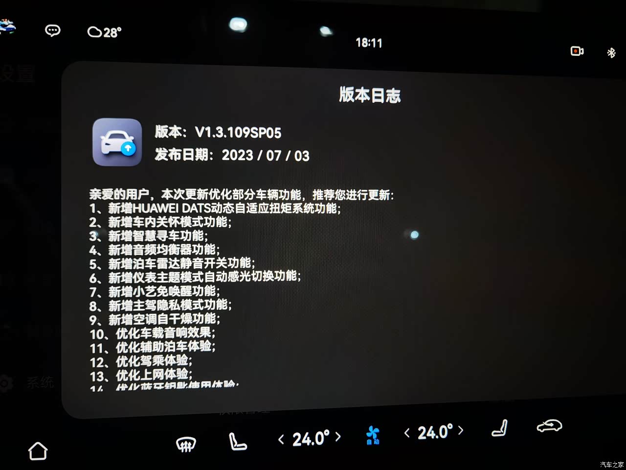 最近一次OTA是7月5日,更新了华为动态自适应扭矩/语音助手免唤醒功能/智慧寻车/关怀模式/隐私模式等等