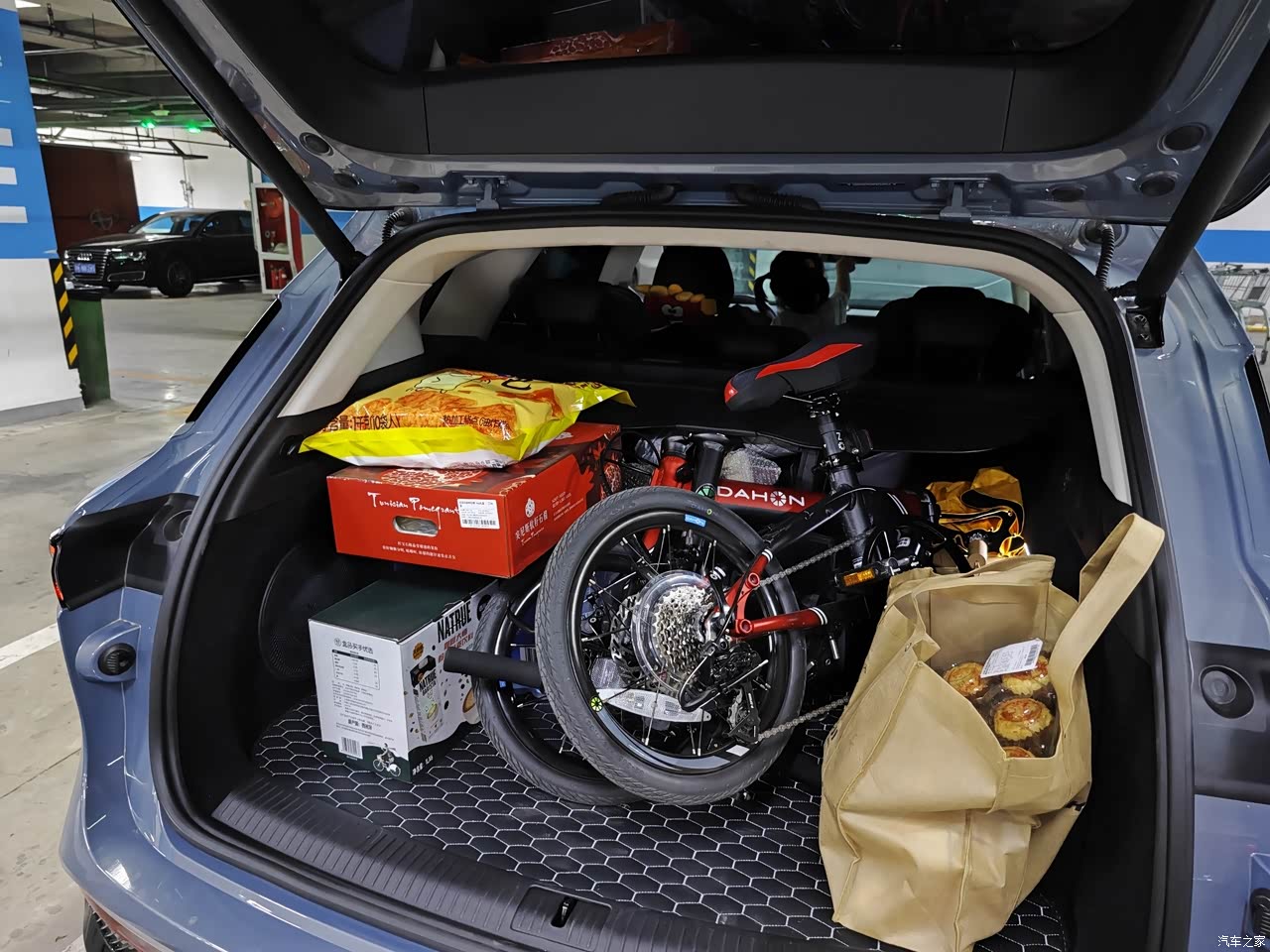 后备箱很大,日常放老公自行车,两个箱子,还有一大提矿泉水