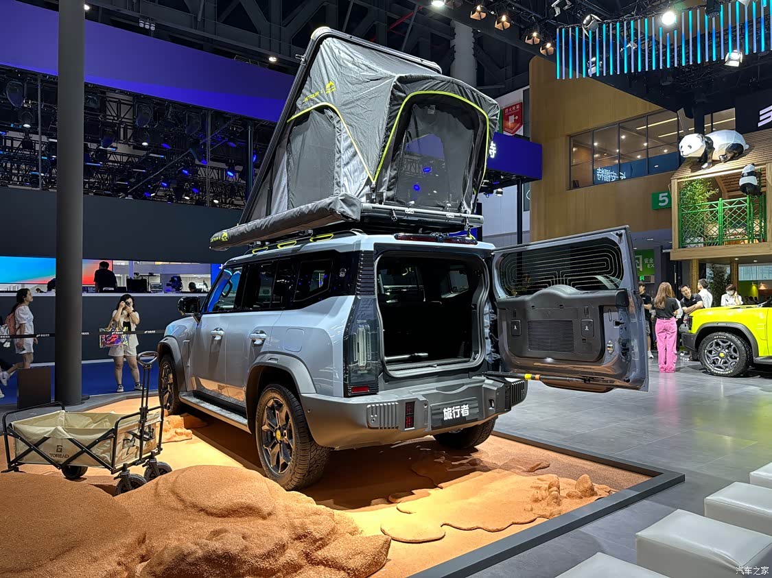 在物质条件越来越好的当下,大家的审美也在悄然发生着变化,越来越多的消费者更加倾向这种硬派的设计,硬朗的线条给人的视觉冲击力特别强,有种荷尔蒙爆棚的感觉。车身周围有一圈黑色的塑料防刮条的设计,不仅增加了车辆外观的越野气息,更是有很强的实用性。车展上的这台车在车顶配备有车顶帐篷,营造一种开着旅行者这台车外出自驾游时在野外露营的场景,我个人是非常喜欢这种感觉的,超级棒!