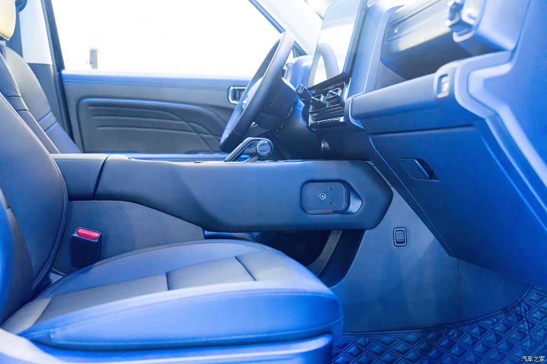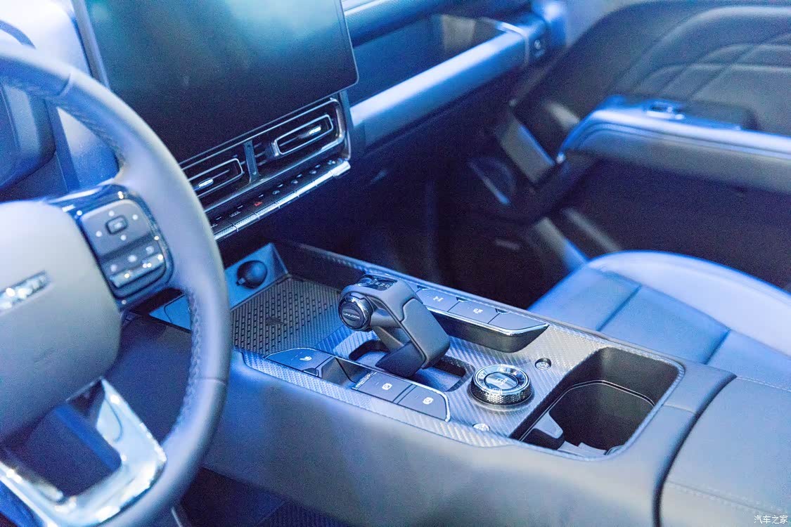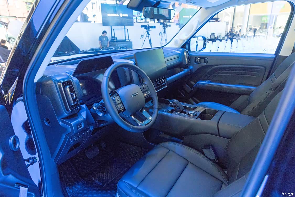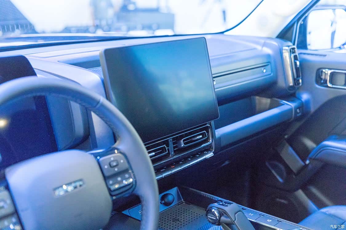 至于内饰方面,新车也采用了较为方正的设计风格,大量的直线与圆角矩形烘托出内饰的大气感,只是这样的内饰设计实在很二狗。有一说一,整车内的用料很考究,使用了大量的软性材质包覆,使其拥有不错的豪华氛围。 新车配备了两块大屏幕,科技感有了,但是大部分功能还是可以通过物理按键来操作,在越野颠簸路况下还是机械按键比较实用。副驾驶前方配备了一个粗壮的把手,这个配置在奔驰G级上也有,可见哈弗猛龙确实在努力向硬派越野车看齐。而三幅式多功能方向盘、飞机操纵杆样式的电子档杆造型与坦克300颇为相似。值得一提的是,新车内饰在很多细节之处运用了大量的矩形设计元素,反正就是让你一看看着就感觉很硬派的样子。