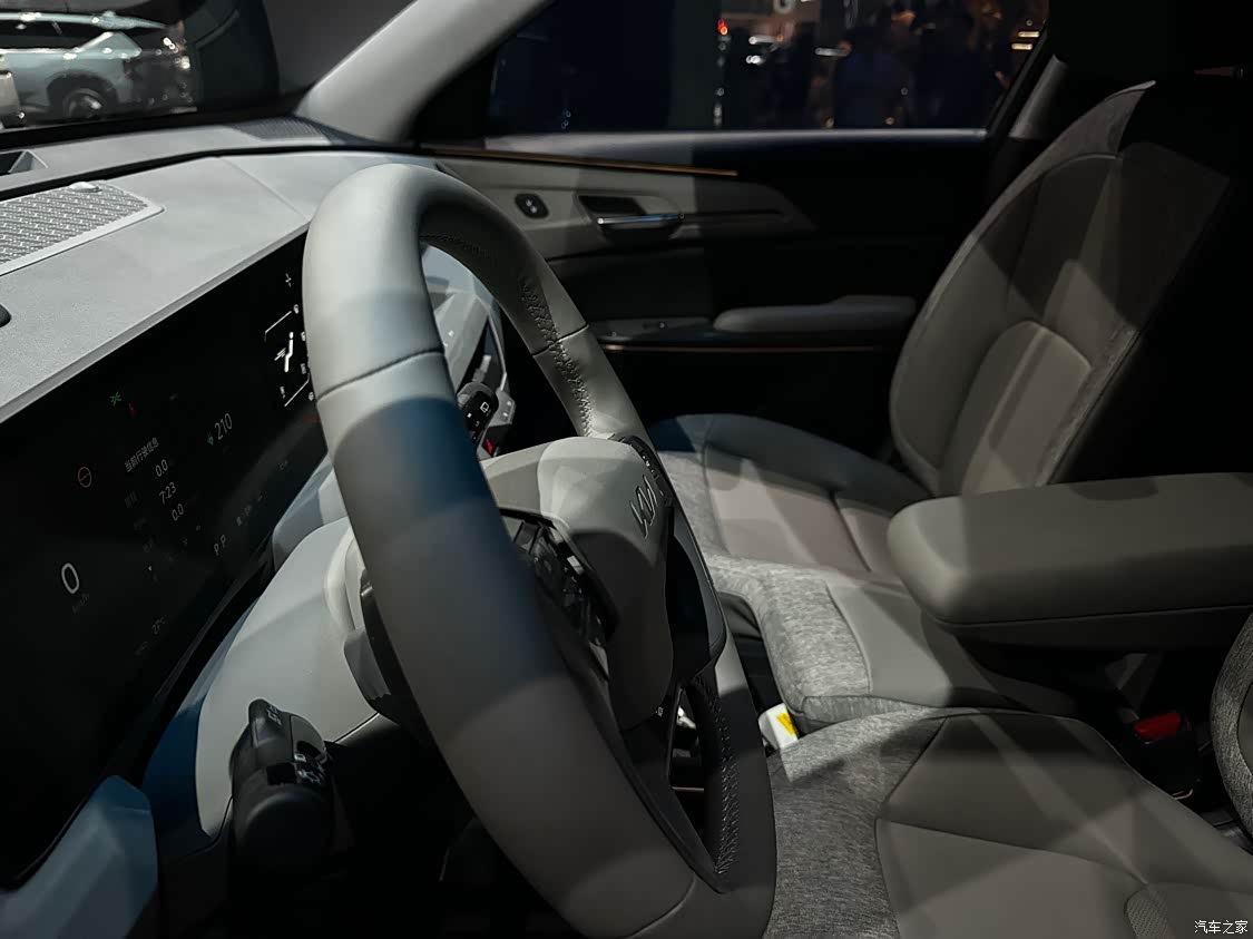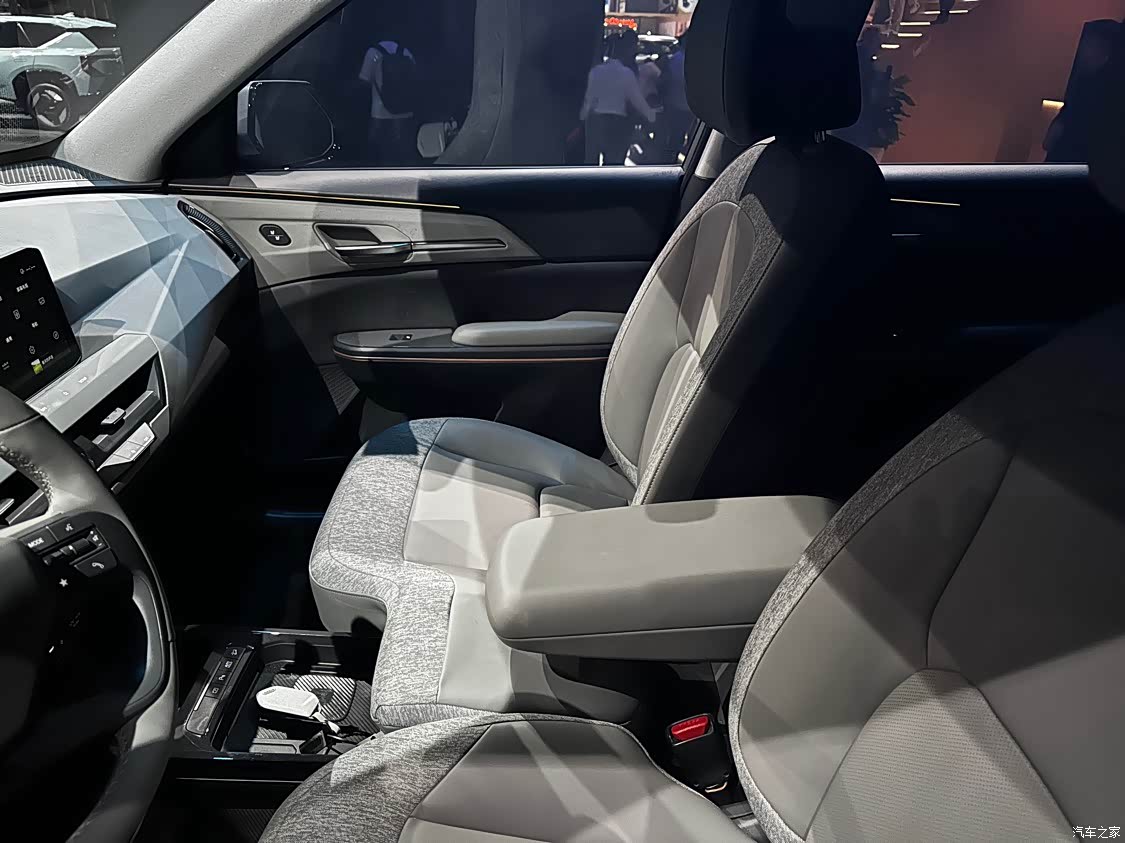 目前这台车内饰还没有对外公布,不过透过玻璃还是可以看到起亚EV5的内饰好像用的织布的材质这个我不是很喜欢,不过车内的这个大连屏看着应该跟EV6的一样,据悉主驾还配备了零重力座椅,最高支持14向电动调节,按摩、通风、加热、记忆等模式一应俱全。