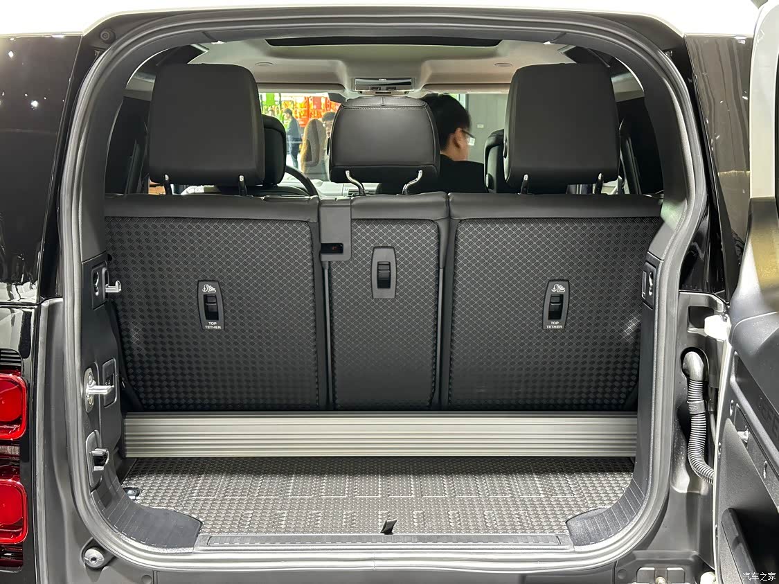 路虎卫士90的车长4583毫米,轴距2587毫米,所以说车内空间就会相对比较紧俏。后备箱的空间和七座车型的后备箱空间差不多大,大家可以想象一下。基本上就只能放进两三个20寸的登机箱。
