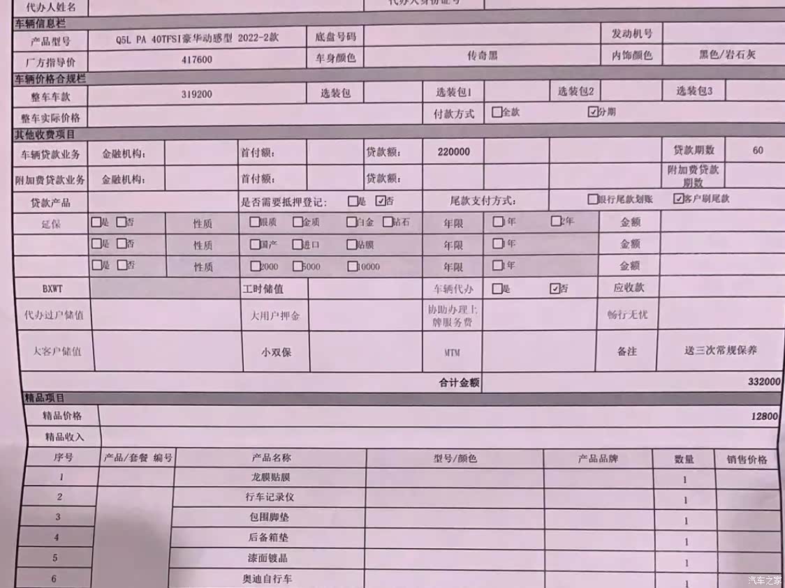 40豪华动感黑色,裸车价332000,购置税14700,保险7500。落地价354200。 这价格必须要贷款,贷款22w,年利率4.8%,满一年提前还,违约金加利息大概1.5w。 赠送:三次基本保险、龙膜、镀晶、行车记录仪、脚垫、后备箱垫以及一些小礼品。 价格虽不是很便宜,但性价比也算挺ok了,空间比宝马x3大,GLC也喜欢,但是价格贵了点。综合下来,还是选择了Q5。