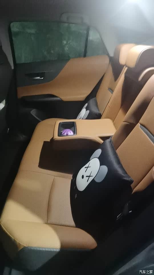 我选的棕色内饰!皮革的材质很少舒服坐着!还有一点氛围灯效果!尊贵版是12.3寸的中控大屏幕,!还有一个后排扶手位!可以折叠的!