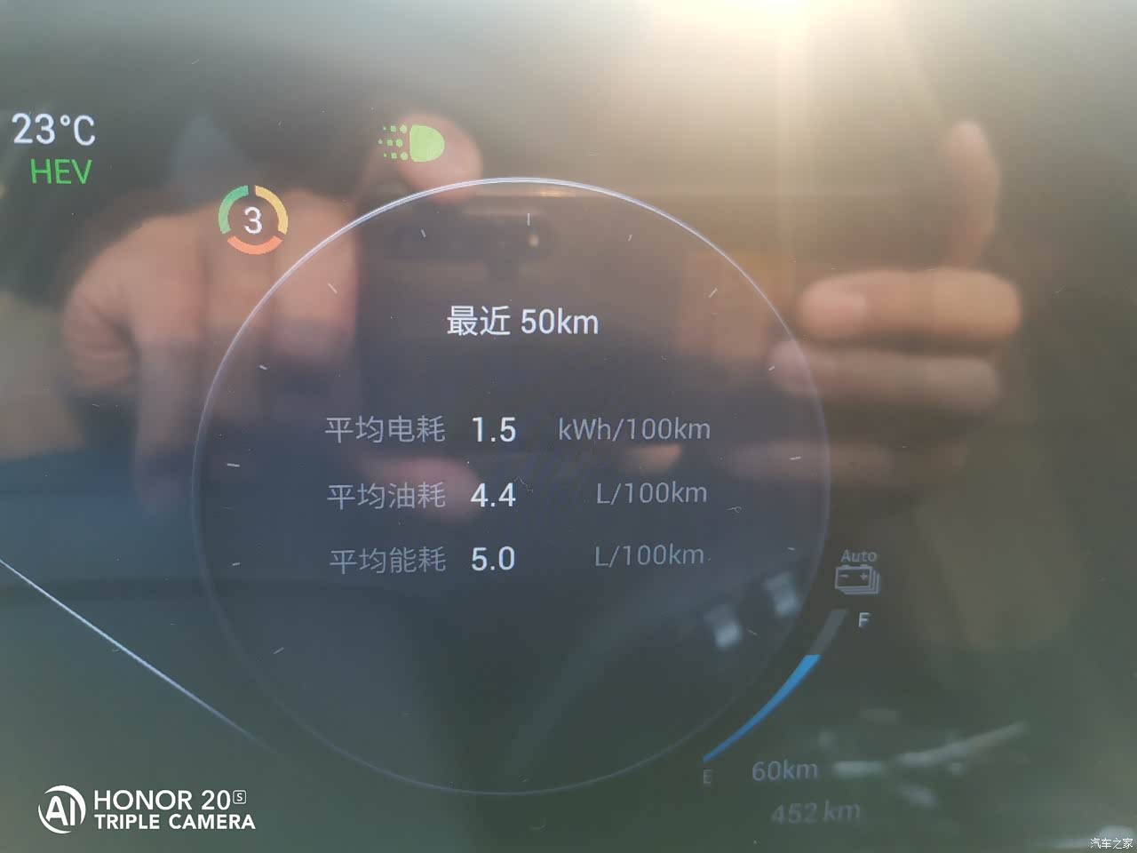 仪表油耗显示。亏电状态跑了116公里,表显油量续航里程减少了106公里,说明油耗也没有虚标。虎八估测消耗了106公里的油,实际上跑出了116公里,实测的数据比表显的数据可能还要好一些,当然这次116公里都是国道和高速,是晚上跑的,路况非常好。 实际亏电油耗。仪表只显示最近50公里的能量消耗情况。昨天亏电跑完后马上充电忘拍照了,亏电油耗没记录下来。刚刚纯电跑了3公里才想起来,目前油耗数据是4.4L,这3公里的纯电应该降了点油耗,但估计实际亏电油耗应该不会超过5L,如果这个数据是真实的,就太满意了。