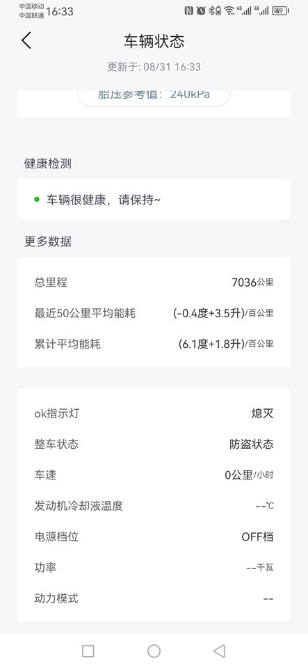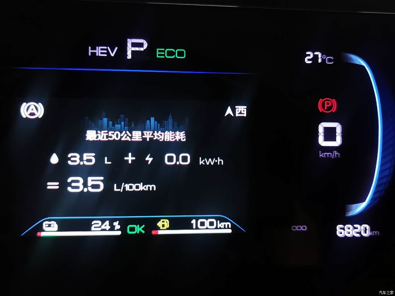 在市里与郊区穿梭,一直都是隔一天充一次电,无法计算油耗,在此情况下,亏电的时候加满油,加油时公里数是5900公里,跑到了6820公里,油箱黄灯报警提示续航里程还有100公里,40.4÷920×100=4.39升/百公里,这就是说920公里加剩余续航100公里,如果满电再加100公里,这续航能达到1120公里,满油满电跑到油箱报警百公里油耗在3.96升,表显续航还是比较准确的。