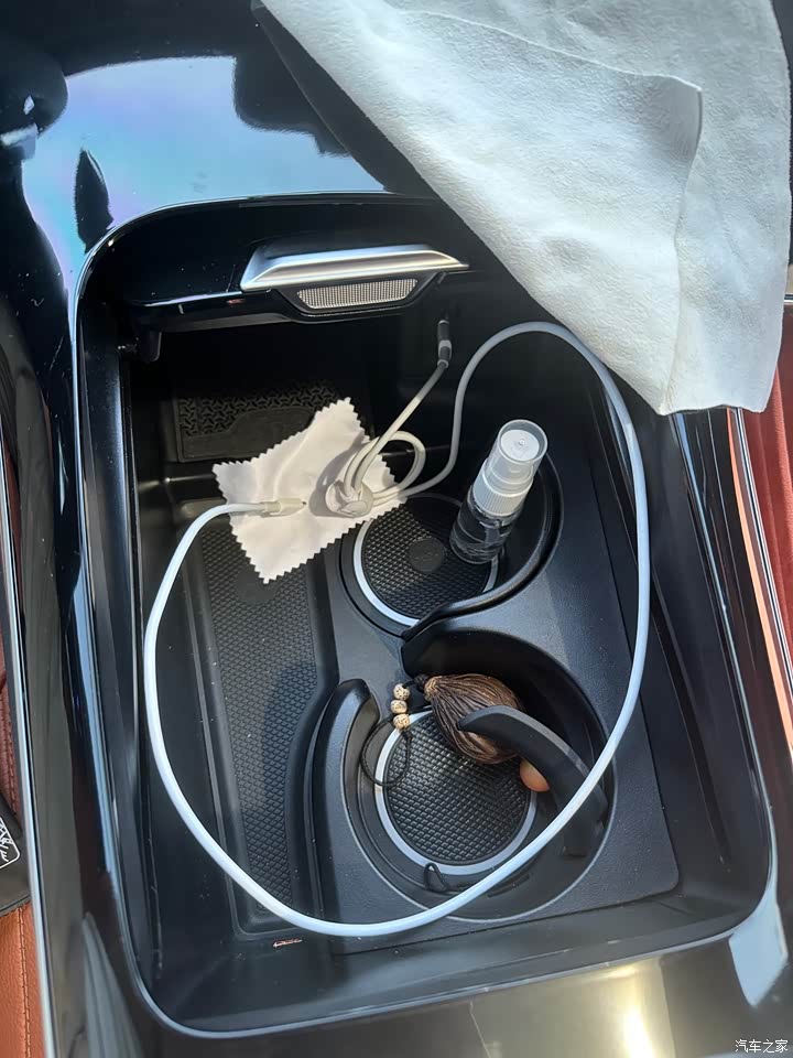 储物空间太少,没有眼镜盒,自己买了个眼镜夹子夹在遮阳板上。门板储物只有杯架,在很下方,放杯子会倒只能放水壶。 中间手扶箱前面那部分空间融合了两个杯架、无线充电等等,也没多少空间可以用,但是这也是唯一可以放手机的地方了。无线充电捅到那个位置,使用不方便我都懒得用,准备买个手机支架用来放手机。