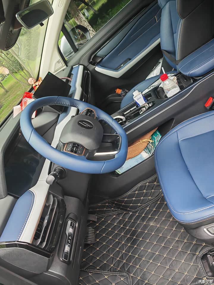 内饰是我喜欢的蓝色拼接,搭配黑色,显得优雅而富有内涵,像个成熟的绅士。氛围灯我选的无级变光的,晚上开车不寂寞。