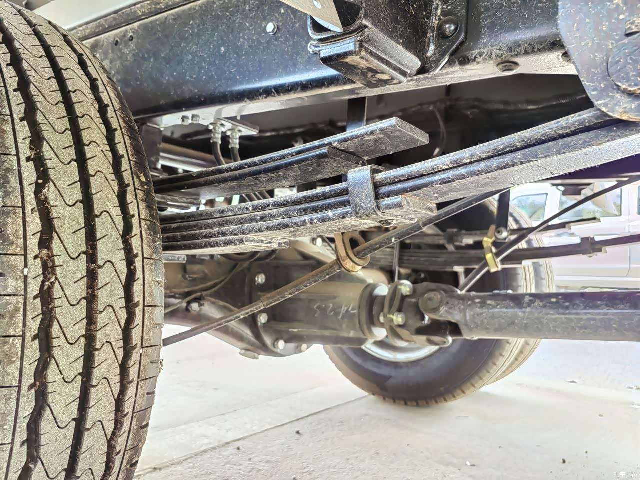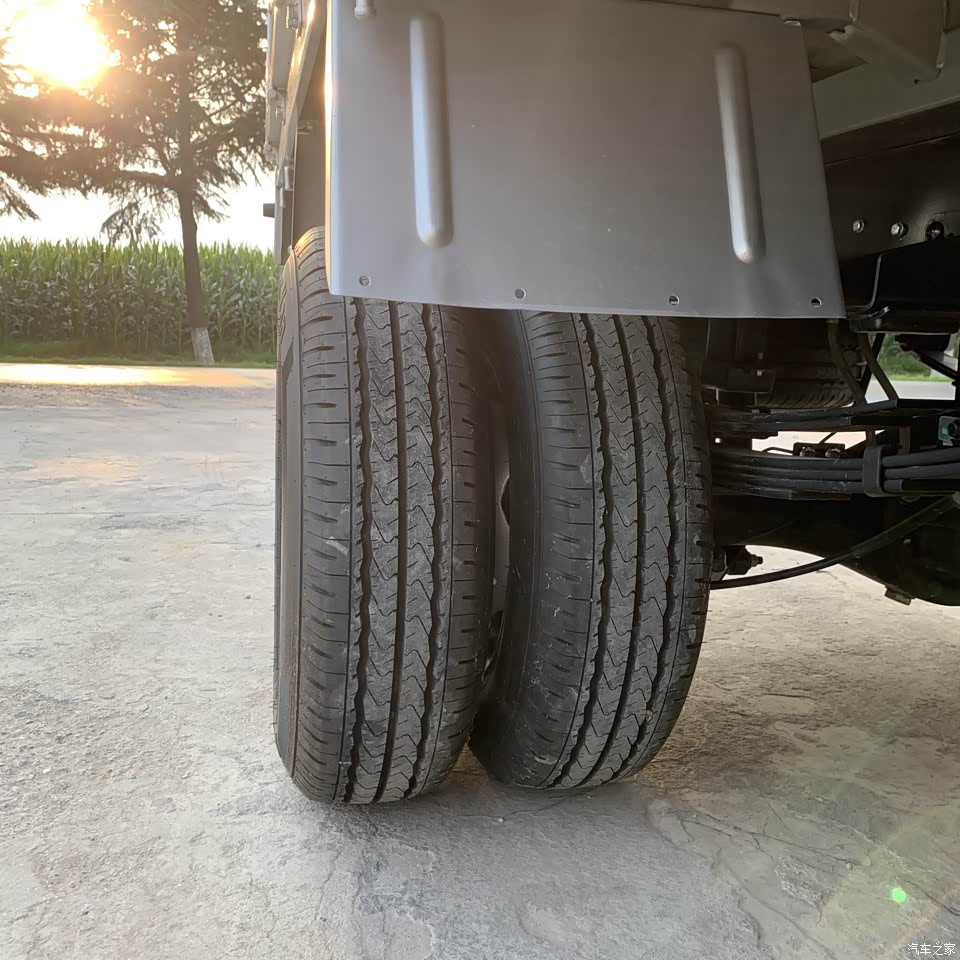 车子后轮用的是双胎的设计,载重量明显就含有安全感,即使一个坏了,另一个也可以接着跑。还有就是这款车子的钢板弹簧,看着就很厚实,满满的安全感