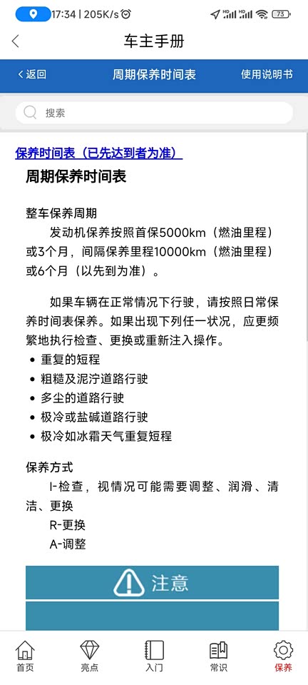 我至今还没有保养过,厂家送了首保。买车时4S店给我说的是首保后按1w公里/半年保养一次,1w公里是综合里程(油电一起的里程)。我现在在欧尚APP里查到的是一w公里燃油里程/半年保养一次,我跟欧尚客服电话咨询人家给我4S店回复,😂。如果按4S店的保养那我这种油用的很少电跑的多的就很不划算了,而且我看机油用的是全合成机油,我都觉得半年就换了都没有达到机油的最佳润滑期。等两天再向客服咨询一下吧,毕竟这关系到车子的质保问题更涉及到后期保养费用问题。