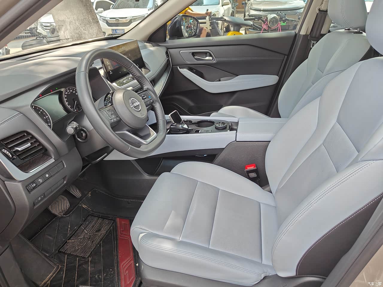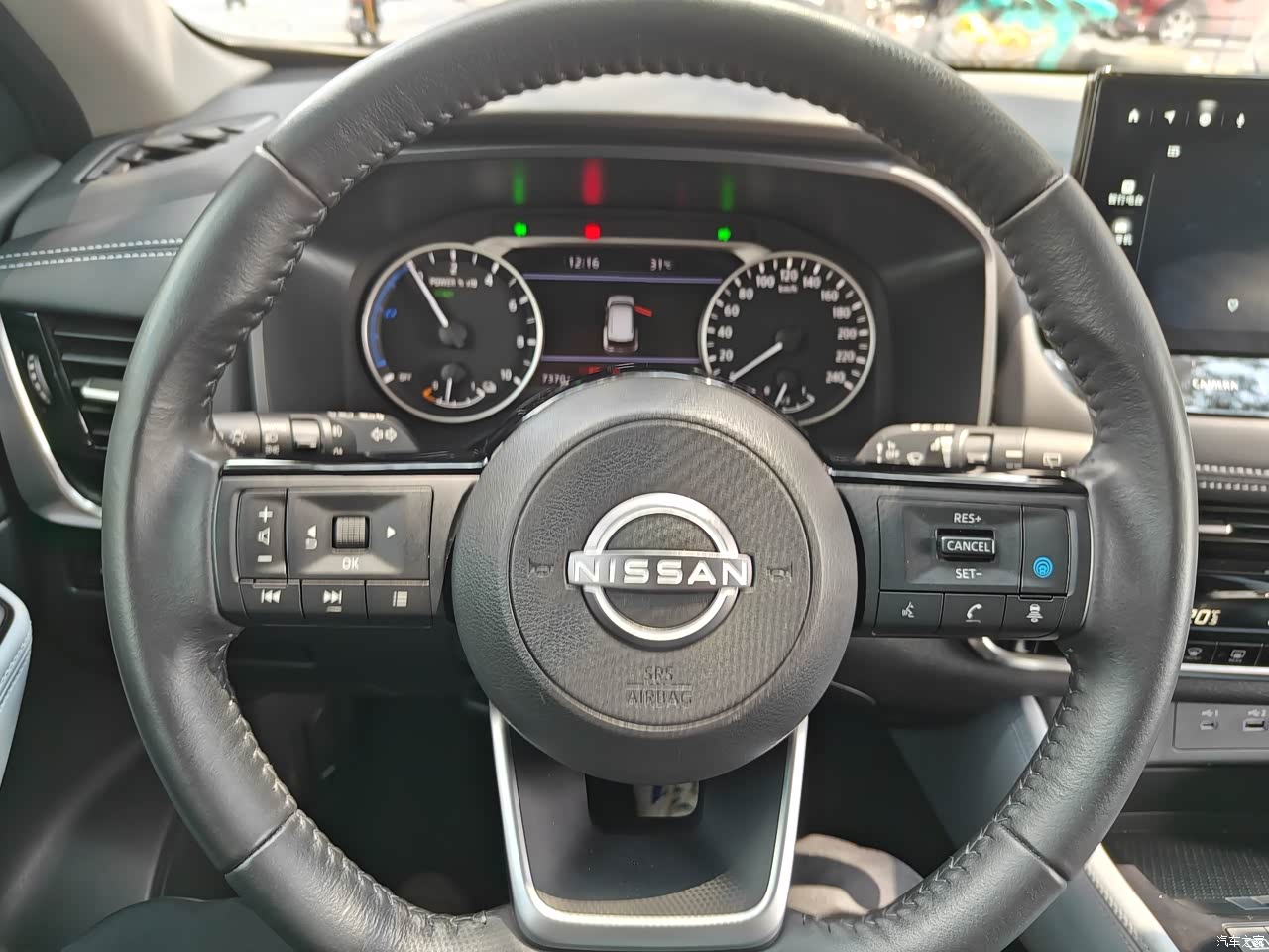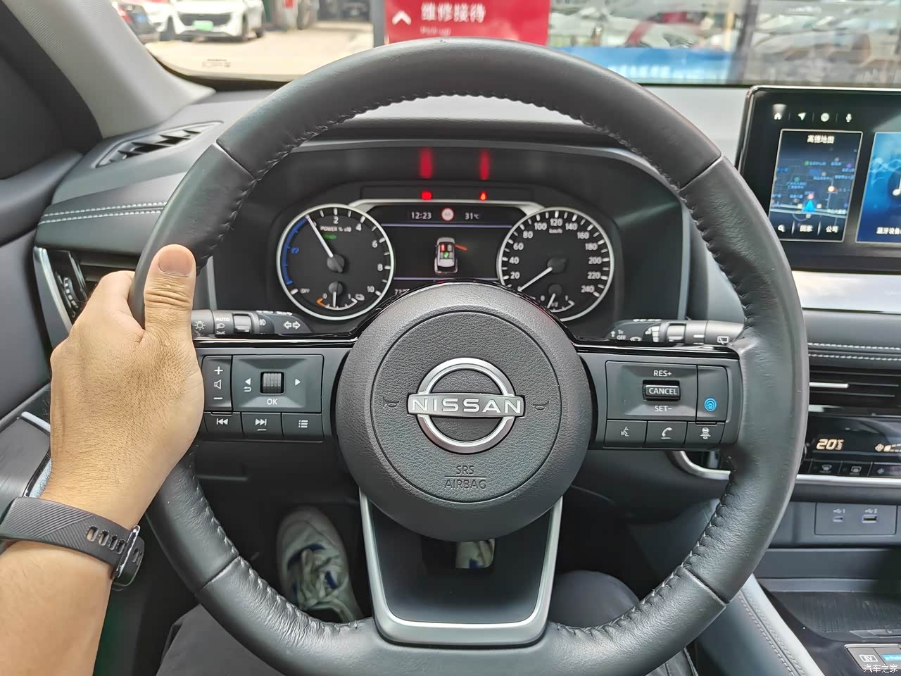这款豪华版奇骏e-POWER用了7英寸的液晶仪表+12.3英寸的悬浮式中控屏,这套组合虽然没有太强的视觉冲击力,但日常使用足够了,像导航、音乐、语音控制等功能一应俱全;奇骏e-POWER车内用了不少软质用料覆盖,触感还不错,但就是整个中控台设计得比较“老气”,不如如今流行的简洁风更直观。 真皮方向盘采用了“D型”设计,无论是握感还是视觉效果,都能给人满足感。美中不足的是,方向盘左右两侧的功能区设计、布局过于平淡,这里可以再优化一下。