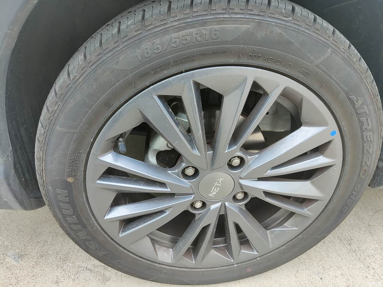 哪吒V的前脸辨识度很高,在路上一眼就能看出来同行车友哈哈,整体谈不上多惊艳,但是很耐看。 401km续航轮毂也是16寸铝合金,看起来很酷。