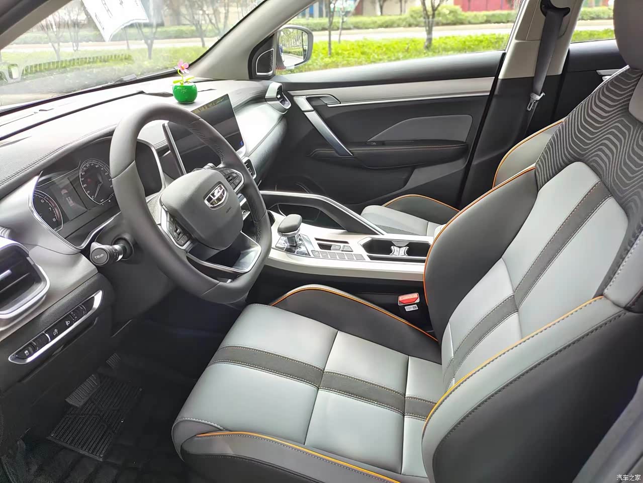 车的内部座椅是皮织混搭双拼色,看着挺有质感得,再加上那个橘色的走线点缀,又和运动得车外观想呼应不得不说现在的吉利越来越年轻化了。简单明了的物理功能按键符合是我想要的顺手好用不复杂。12.3大屏与智能语音交互系统搭配又充满了科技感,在导航时后排的人也猛看的清楚明了。座椅的支撑感与手感也刚刚好,看的出吉利厂家这块挺用心得!