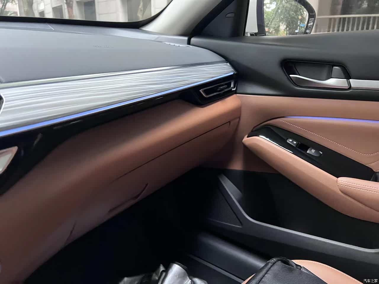 简约风的内饰风格,我选择的棕色内饰,简洁大气,车机悬浮在中间,便于操作。车机流畅度,清晰度还OK。相对于黑色,棕色内饰更显得高档、耐脏。