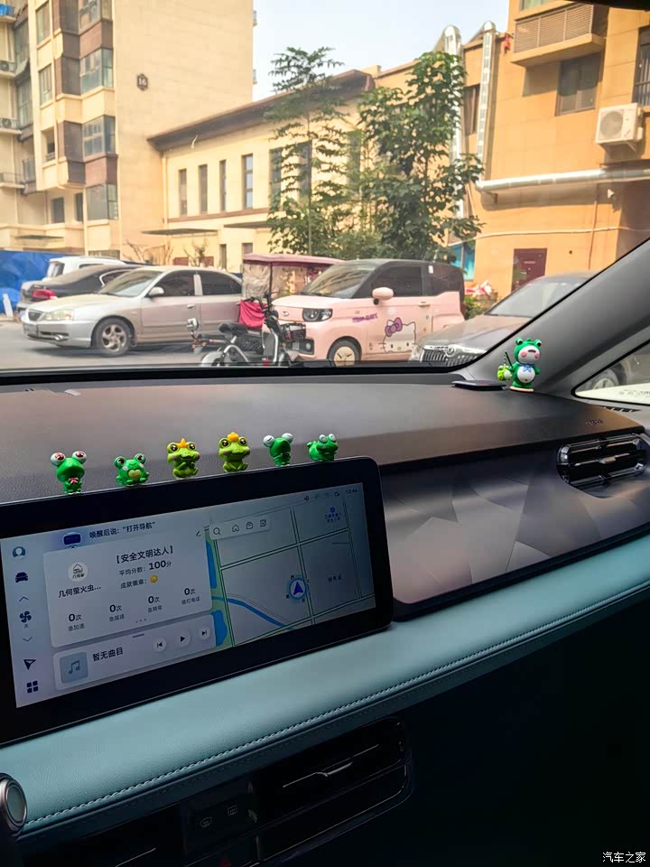 内饰我自己在网上买了小粘贴,可可爱爱没有脑袋哈哈哈,在网上买的其它挂件还没到,这个内饰双拼色我也很喜欢💕因为我就喜欢这个颜色,买的时候果断就选择了这个颜色,好看而不俗气的颜色,特别耐看,越看越喜欢,是当下流行的多巴胺配色,每次开车心情都会大好。