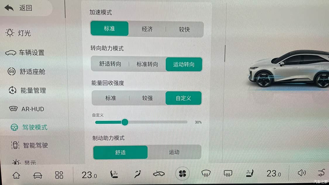 运动模式 加速很快,我基本不怎么用;经济模式加速很慢,动能回收基本在100%,油门送掉后的减速感很严重;舒适模式可能正适合日常使用,动能回收也刚好,用过一段时间之后,车机会自动生成你的专属驾驶模式,还是挺准确的,车友们的可以用一下,我用的是自定义,自定义驾驶模式更适合我