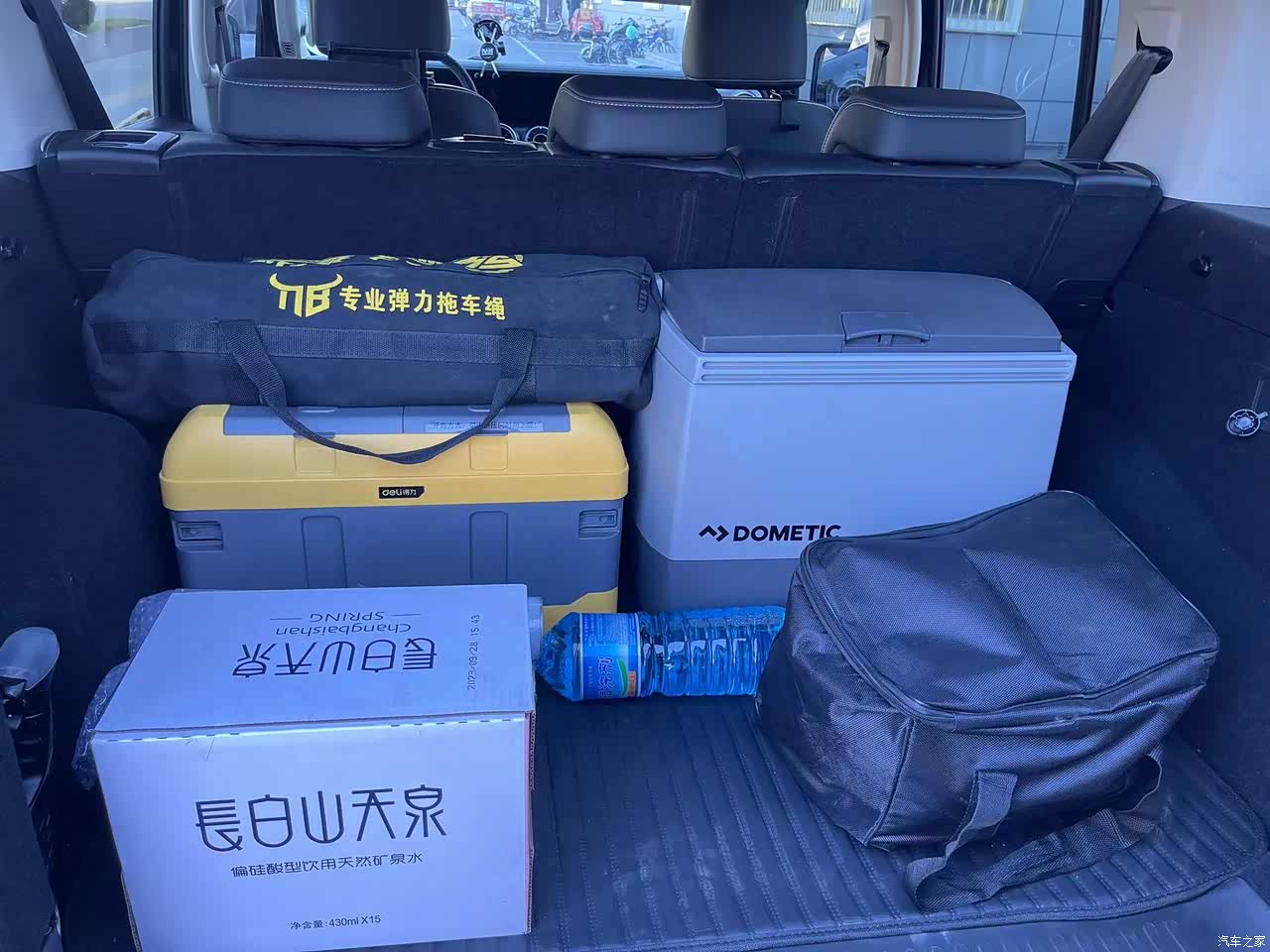 本人178身高,前排调整好后排空间宽敞大概有2.5拳头的距离,中央扶手箱储物空间也是够用的,可以放两瓶水,左右车门可以放有可以放一瓶水的空间,后备箱空间较小,我放了一个储物箱,一个20L的冰箱就占据了1/3的空间,出去越野的时候再放一些气泵、拖车绳等救援工具就满了,有露营需求的要加装拓展装备。