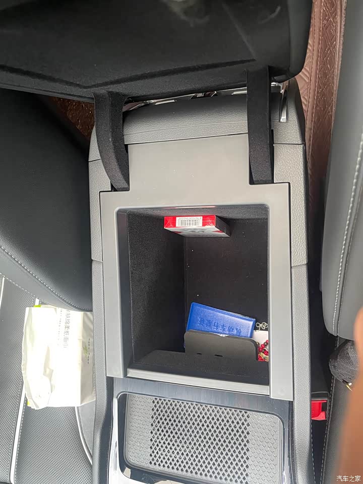 扶手箱容量很大,大家可以参考烟盒,而且里面还有一个隐藏空间。杯架可以放下绝大多数日常的使用的保温杯,奶茶,饮料。手机有一个无线充电的位置。中控屏幕后面还有一块镂空的空间,里面有一个C口和USB口,我是用来插U盘,放毛巾的地方