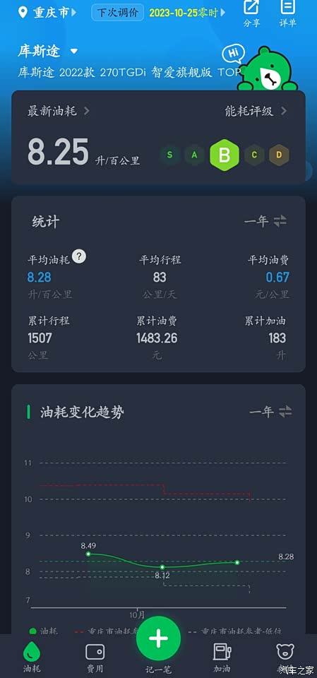 整体油耗目前8.3L/100km。但论坛车友有5.0的,也不知道怎么开的。