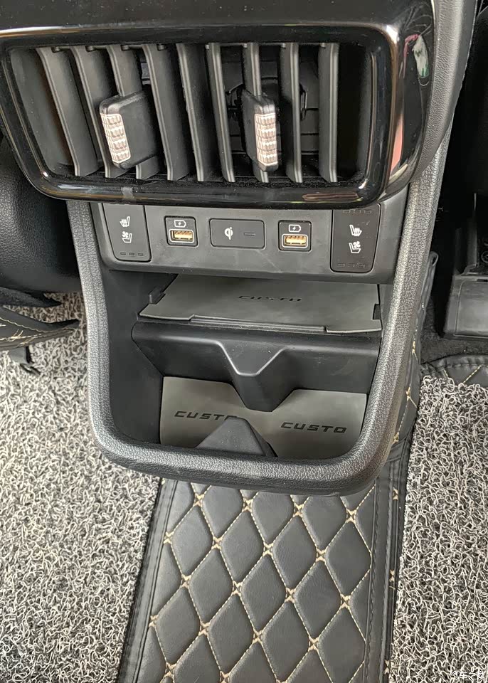 该车杯架杯槽特别多,三排两边各有两个杯槽;二排滑门上各有一个、扶手箱后部位也有两个;前排门上也有,中控扶手也有两个杯槽。第一排的靠背后有小桌板,虽然也有杯托,但那个确实鸡肋,只能放锥形杯子,也就是上大下小的,否则卡不住,会掉。