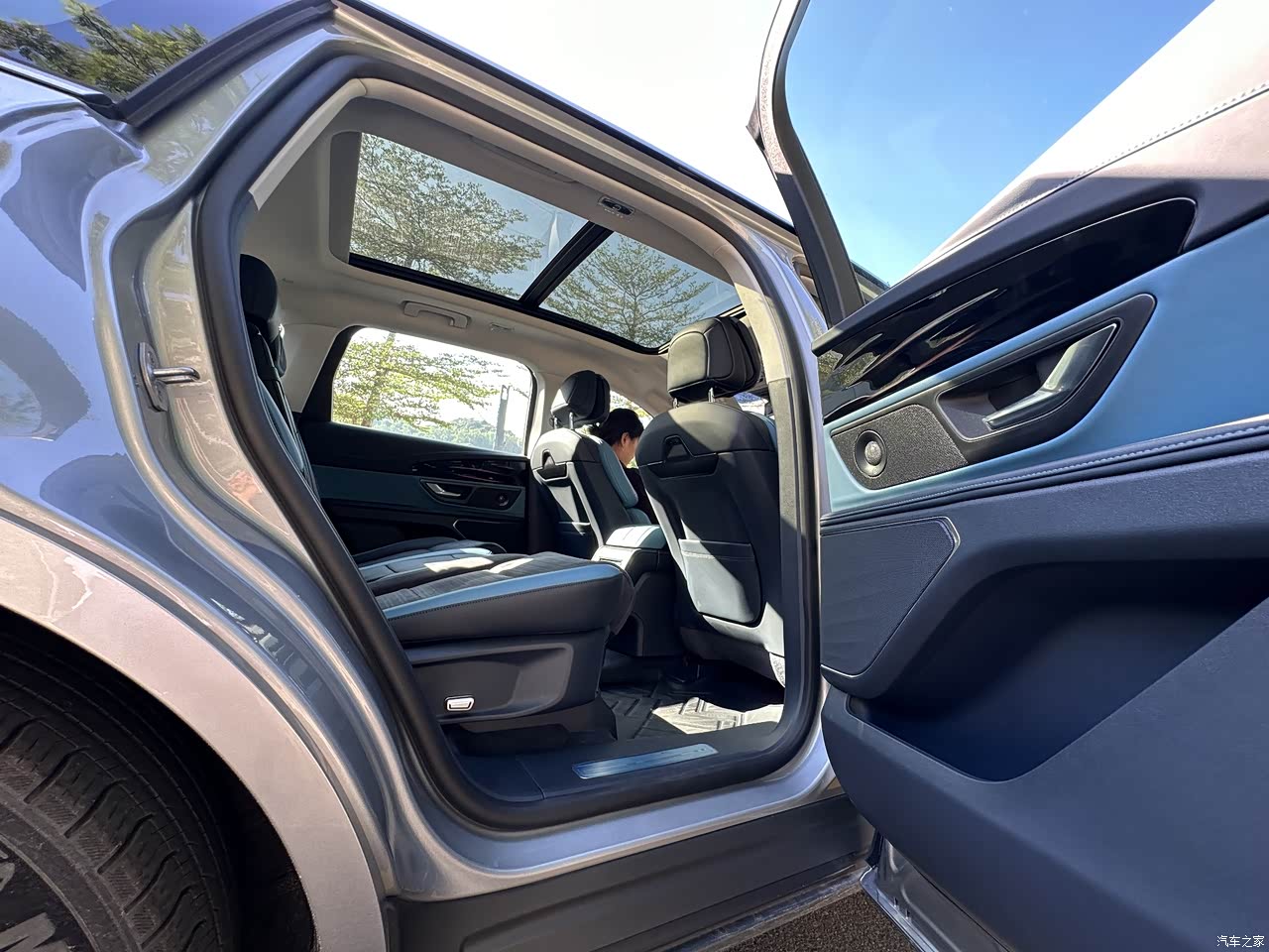 打开车门,内饰的设计更深得我心,科技感十足的三屏交互,造型简约却又不简单,搭配着车漆给人的感觉就是一种优雅又沉稳的格调,生态麂皮绒的座椅也是很舒服,搭配着电动可调节的二排座椅,可以想象到时候自驾游的路程上有多舒服,后车排竟有触控屏,座椅通风加热,按摩功能,腿托也能自由调节,前后任意一排都是头等舱。