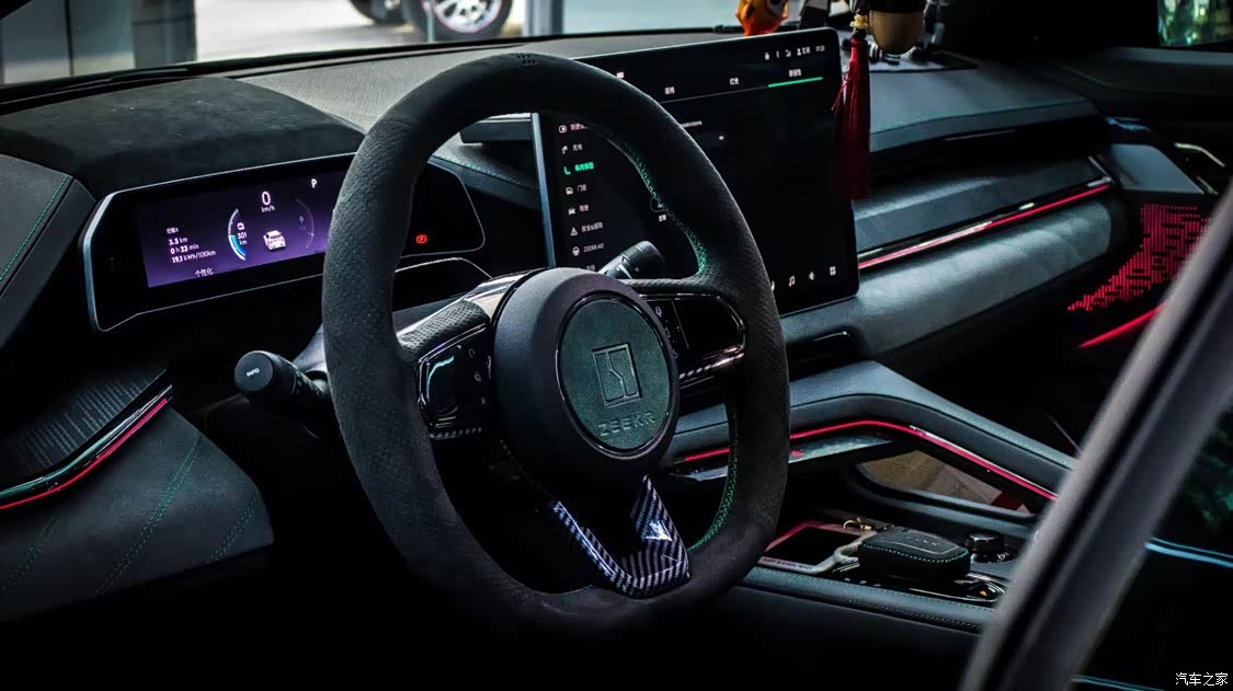 内饰做工用料足,对比过其他车型,相较毛坯房、伪真皮,001的真皮舒适度给人一种高级感,方向盘带了翻毛皮套,搭配一套灰绿色调。