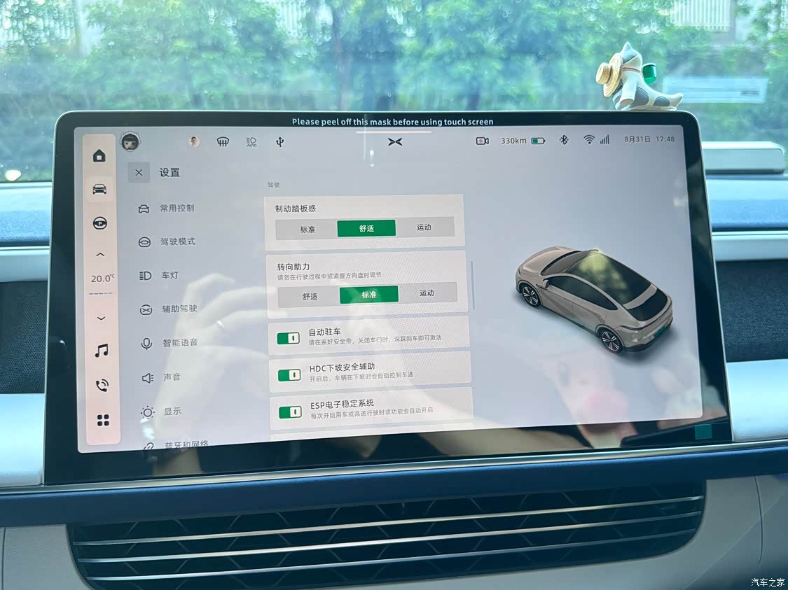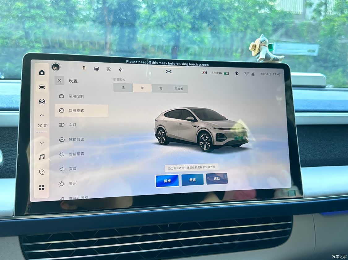 驾驶模式:每个人的驾驶习惯和偏好不一样,所以建议自己提车后,找条车少的线路,把关于动力响应和刹车力度的各项设置都体验一遍。我日常用的动力是“标准”,动能回收是“中”,制动是“标准”。刹车前半段会比较虚,不过挺适合我的。一脚电门踩到底,能明显感受到推背感,如果用弹射模式的话,那感觉就是”风一样的自由“。特别是红灯变绿起步的时候;方向盘转向比较省力,但是有一定的虚位,个人觉得可以接受,没啥影响。;前双叉臂后五连杆,整体调教确实适合家用,体感上比P7要软,家人乘坐感受是舒适的。虽然是无框车窗,但是隔音效果确实不错。时不时有点空调工作的声音,但是也没达到扰人的程度。整体的感受是满意的,提供了比较好的静谧性。