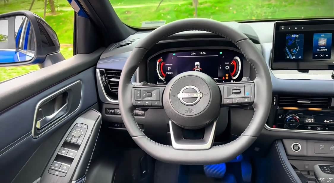 内饰和老款逍客一样整体为软性皮革包裹,触感舒适,提升了质感的同时也拉满了整个舒适性,好的优点继续保持了。 全新第三代逍客升级中控屏为12.3英寸,UI界面漂亮,布局清爽,在12.3英寸全液晶仪表12.3英寸中控屏+10.8英寸抬头显示的三屏交互共同作用下,科技感直接拉满,老车主实名羡慕! 换挡杆也更加小巧了,D字型造型三幅方向盘以及独特的电子档杆设计看着就很运动,这也是我比较喜欢的一种设计方式。 没有给满分的原因是,真皮座椅换成了皮织物混搭,舒适度没有感觉明显的变化,但是相当于减配了,相比较我肯定更喜欢真皮了~