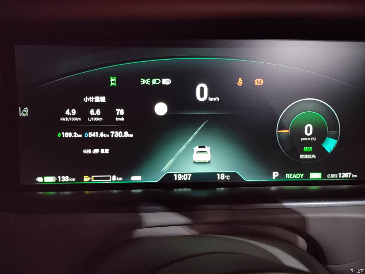 官方理论续航标注为210+991=1201km,高速续航达成7.5折,纯电210城市跑180。 用三组实际使用的数字来描述一下 1.成都出发往武汉方向,满油满电燃油优先模式,到抵恩施崔坝服务区表显路程731公里均速78,剩余电量70%130km,余油约6升(油箱56升加油跳表50升)折算80km,预计能跑过900km。表显百公里耗4.9度电+6.6升油,高速这种能耗还不错。 2.用智能模式跑山路有上陡坡有下急坡,剩余电量25%增程器启动,表显纯电跑了159km。预计180公里左右。 3.用保电模式,表显剩余油量0km,在电量不减的情况下,跑了30公里后,加油52升跳表(即表显油箱空了后跑了30公里仍至少余油4升),估计表显空油后能跑80公里左右。 续航表现很不错了。
