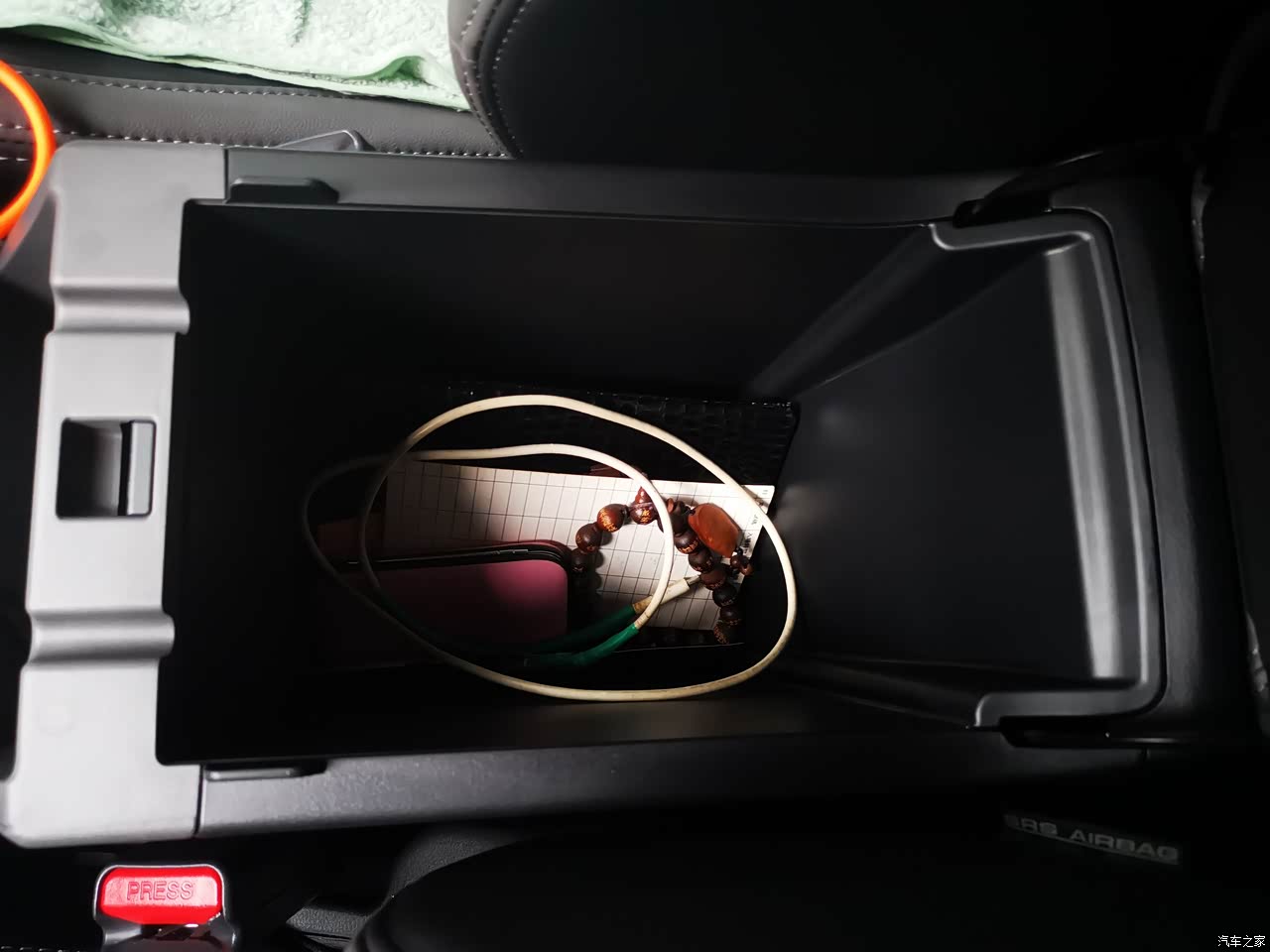 中控扶手箱够深,够大,可以放很多东西,中控下方储物的手机槽可以放一部大尺寸手机,杯架限位深度大小刚好,放我的水杯,不高不低,也不影响右手搭在扶手箱的操作。喜欢中控的大屏设计,大气好看,操作方便。