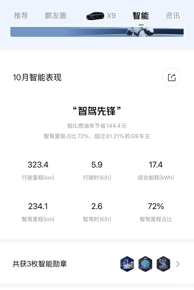 智能化我给满分,理由是对比了几家同类车,小鹏的智能化做的最全最好用,不管是车机语音还是辅助驾驶。一上车全家人都不用喊唤醒词就可以操控“小P”完成大部分指令,我10月刚提车就实现了66%的智能驾驶覆盖率。