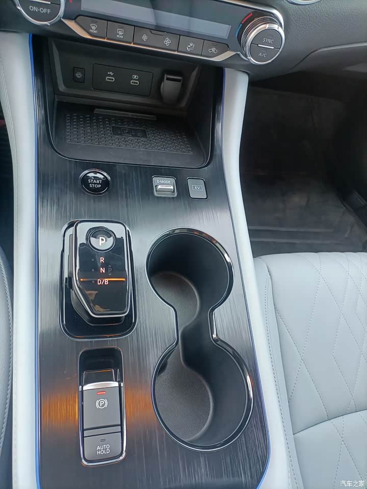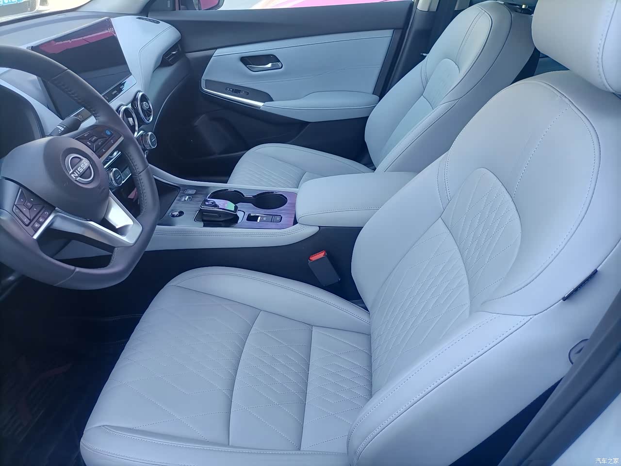 内饰的双拼色搭配充满着温馨感!米白色的座椅看上去充满了精致。皮革的走线特别的精细。车内许多地方都使用了皮革包裹,使整个车内看起来高档了不少。扶手箱前面杯架和档把这里,表面覆盖使用了拉丝装饰,看得出来,日产在轩逸e-POWER的内饰装饰上很是用心。方向盘是全真皮包的,在手握方向盘时,握感很好。