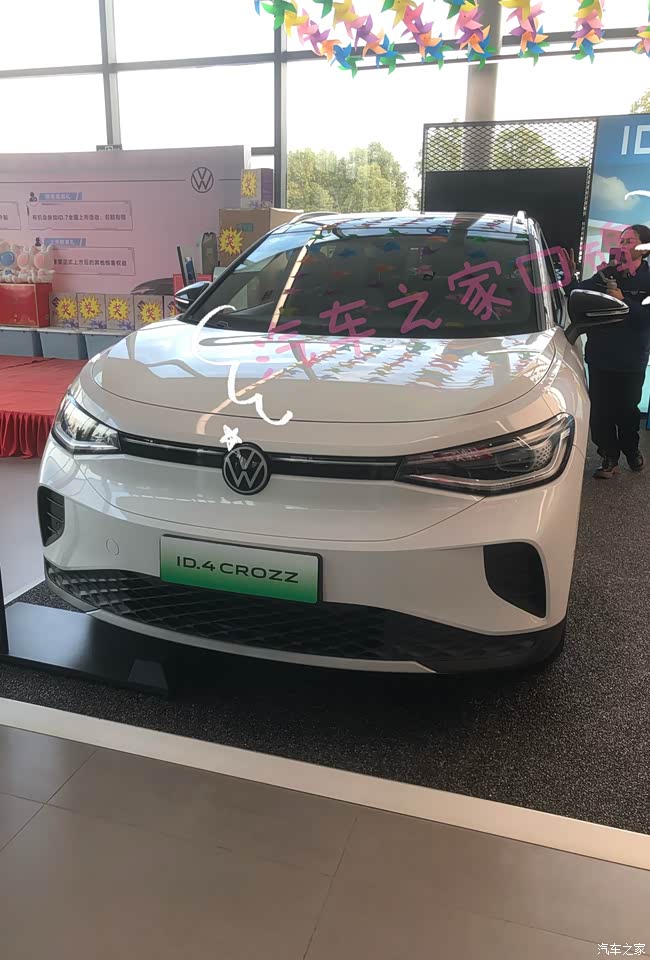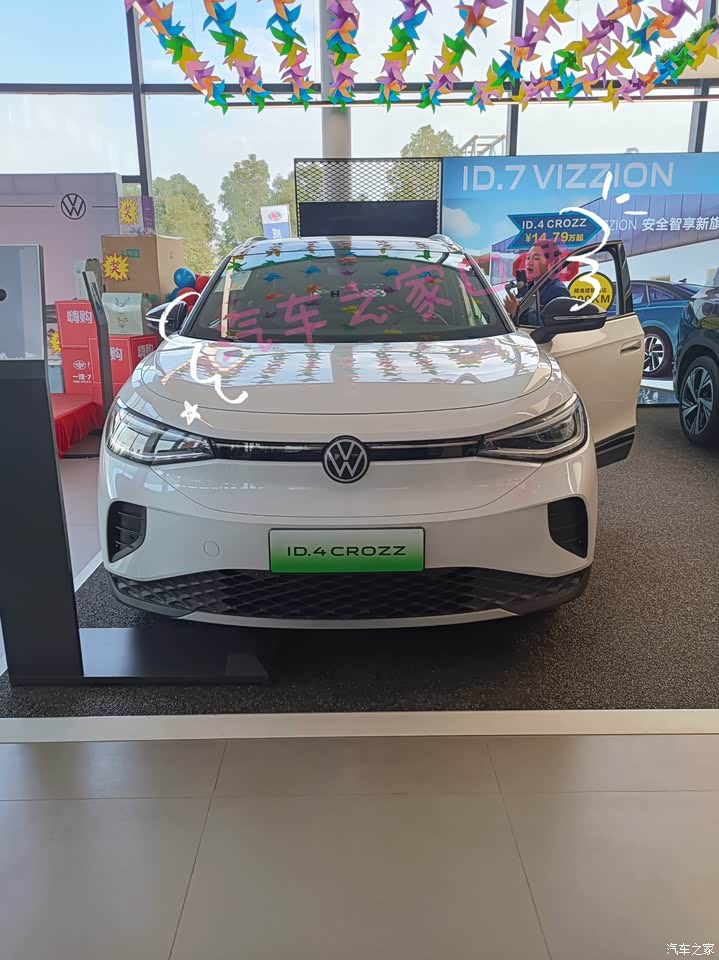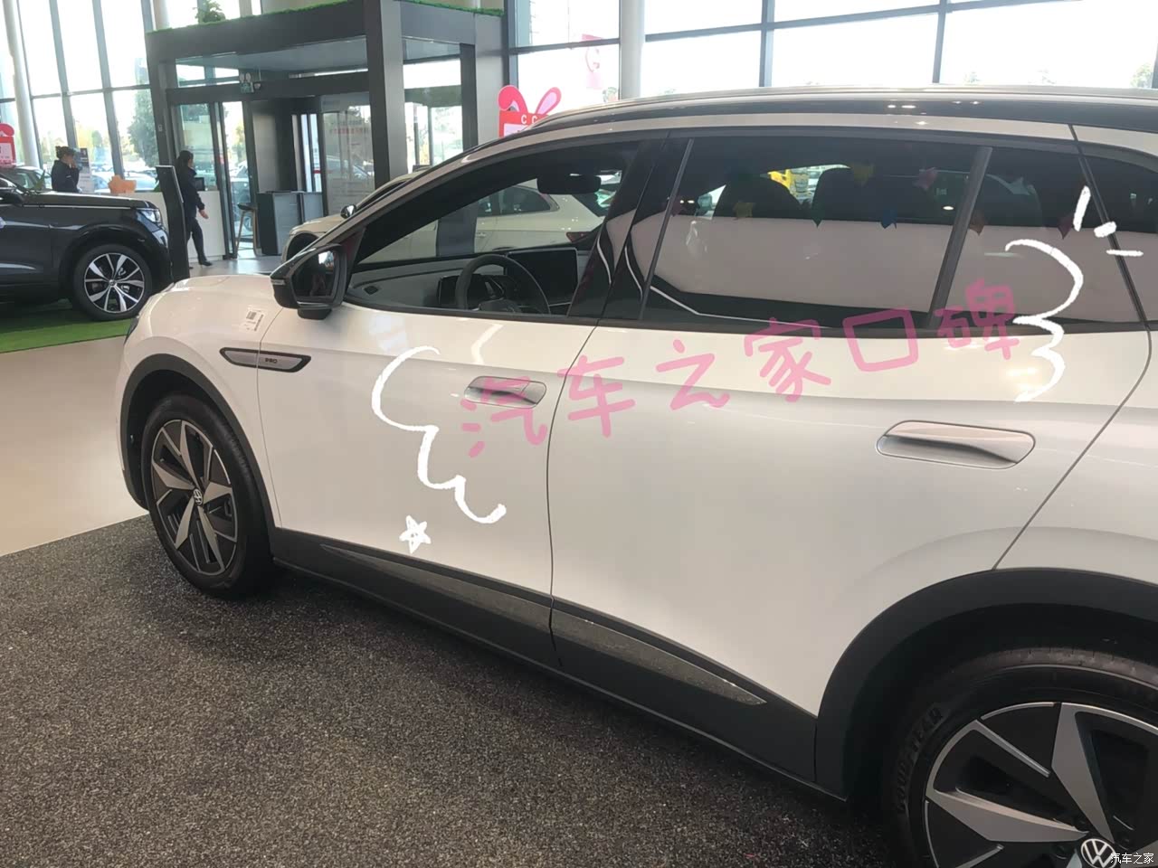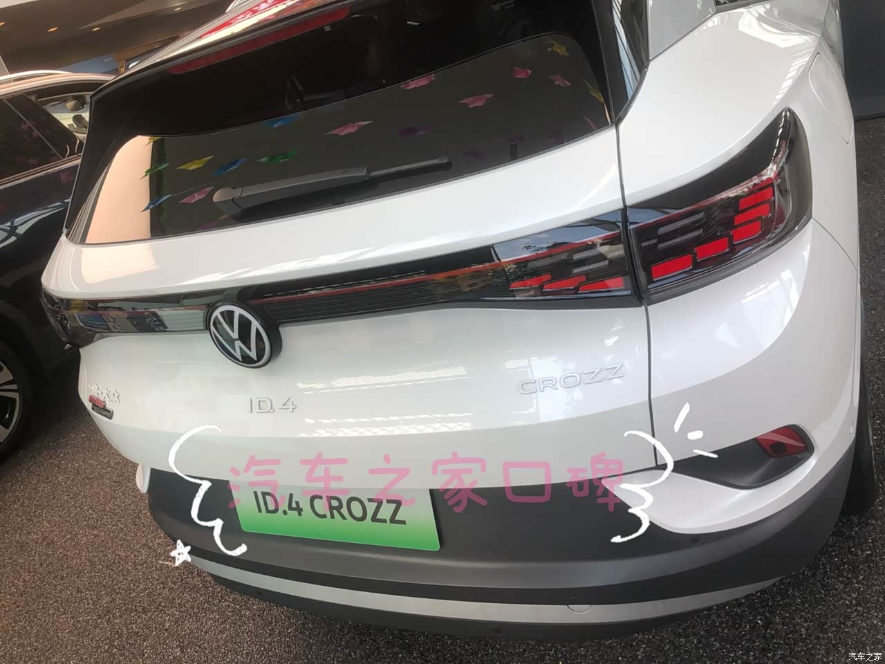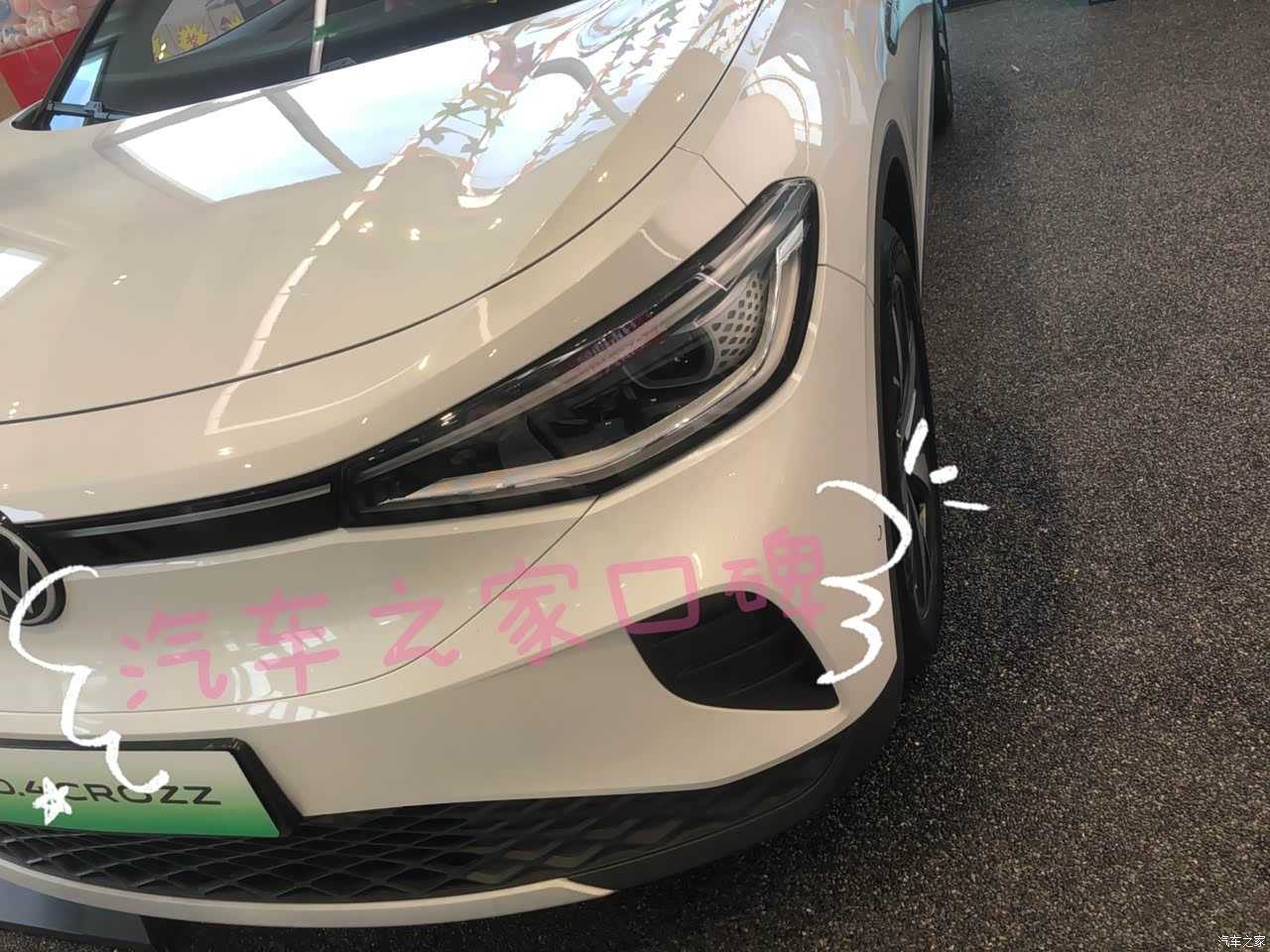 一年多以前买了一辆五菱宏光mini EV,平时接送学生上下学还是挺好用的。虽然好停放,充电便宜。但是有时候回老家,3、4口人挤在一起,实在是太难受了,特别是后排腿都伸不开,时间长了都抽筋儿。导致后来回家都没人坐我车了。所以一直琢磨着给家里再添一辆大一点的车,用于家庭出行使用。作为一名女司机,肯定是颜值控啊,ID4 CROZZ的外观非常符合我的审美。圆润饱满的车头,搭配奶白色的车漆,有一种白海豚的感觉,是我心目当中的梦想之车。