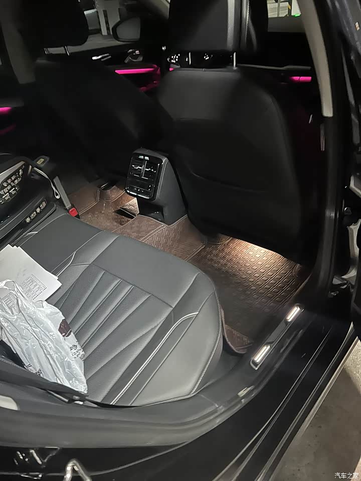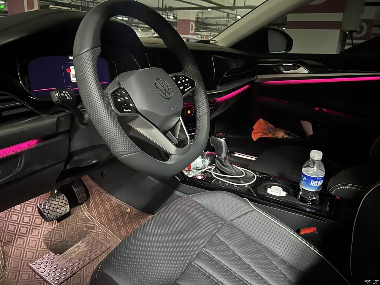 方向盘质感还不错。内饰的氛围灯是个亮点,但是对我来说用处不是很大。停车以后,有那个迎宾灯,打在地面上,很漂亮。