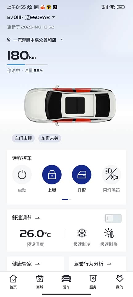 APP远控可以实时监控车辆状态,可以远控启动,制冷加热,可以远程锁车关闭开启车窗。