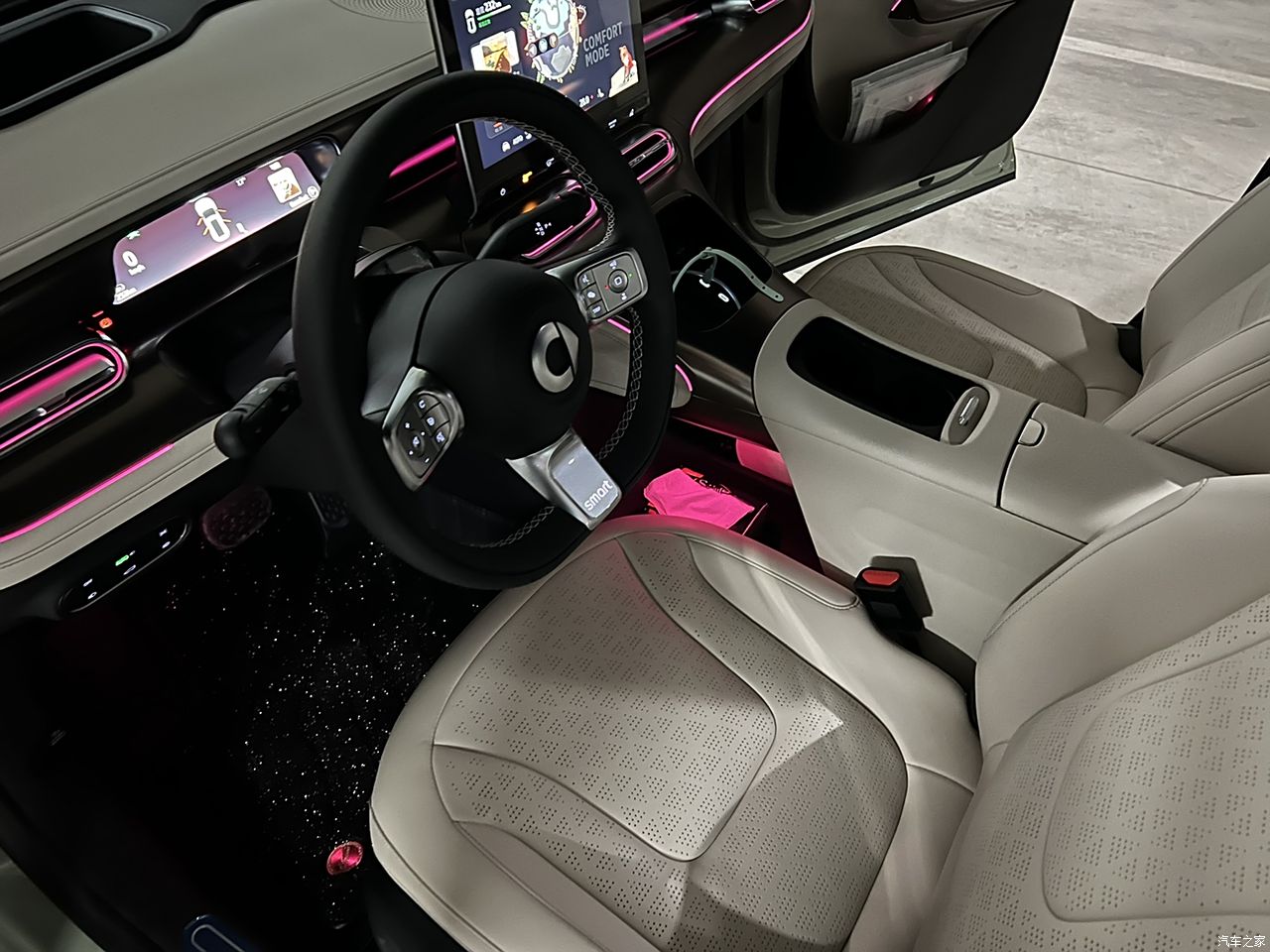 超喜欢内饰!!氛围灯太好看了!白色真皮打孔座椅配上座椅通风和加热,真香,就是通风功能不是赠送的,哎 因为氛围灯打满分💯