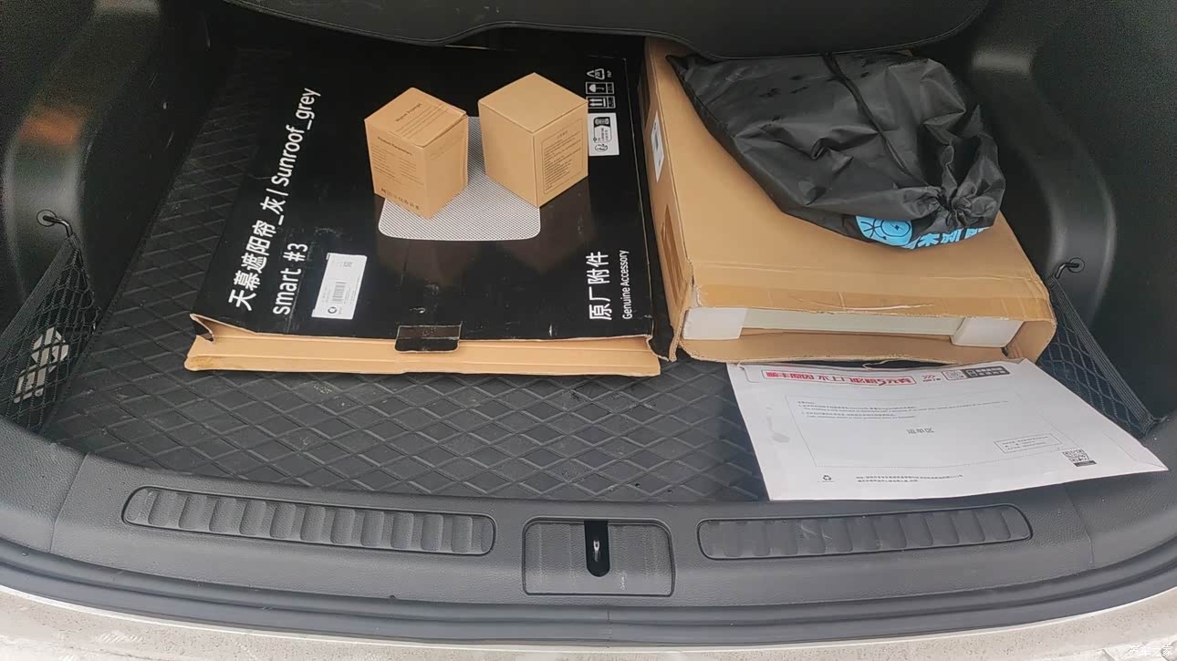 车头空间有个小储物隔,应该能放一双鞋或者其他零零碎碎的东西,还不错。后排空间其实挺大的,表面看着一般,但是有个下凹储物槽,我在下面放了一张1.2m长的蛋卷桌和三把月亮椅,刚刚好放,上面空间可以放置两个行李箱,还有出去游玩的一些杂物,完全够用