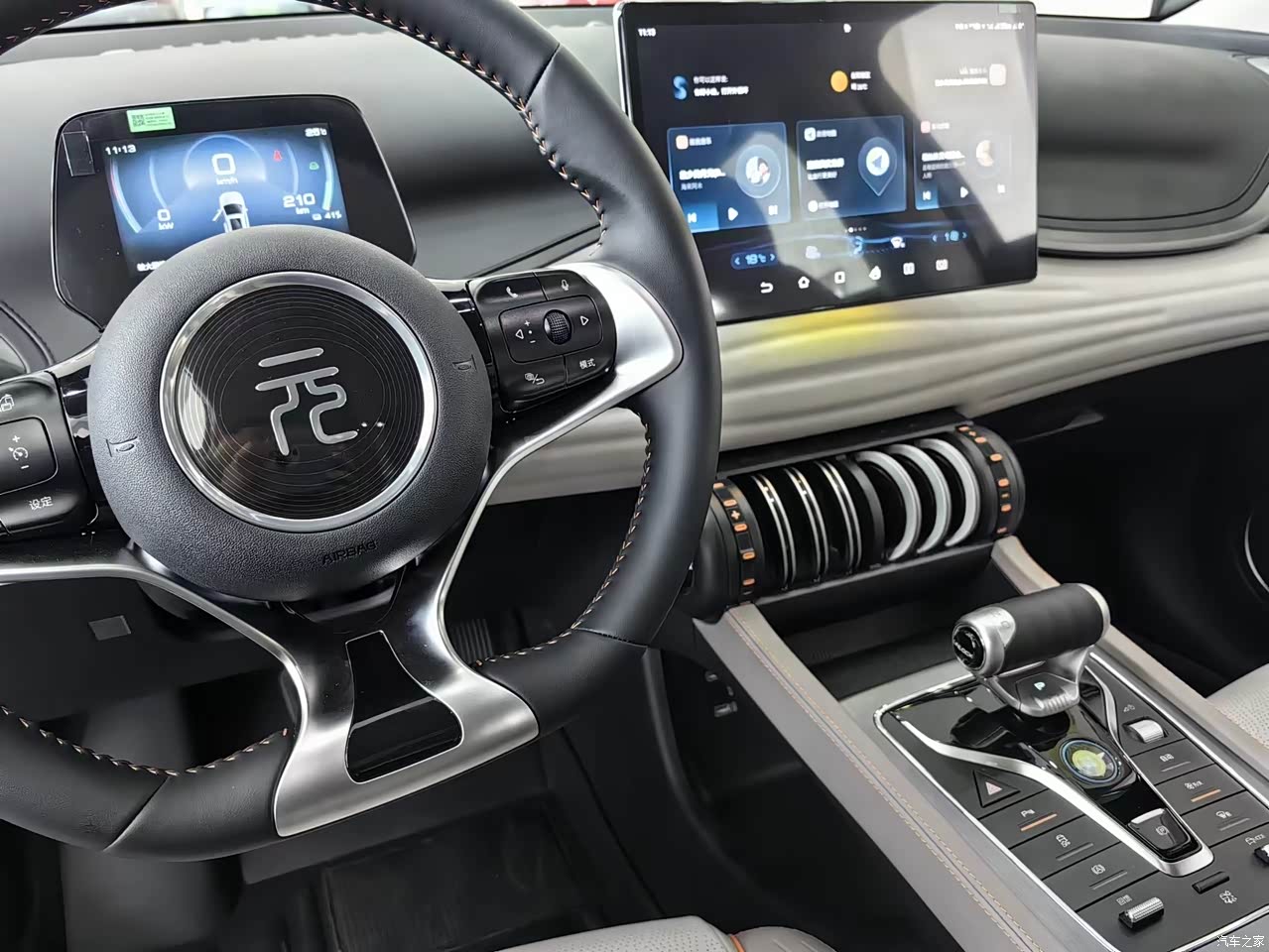 轻奢米中的双色内饰,还是简简约约有点这种清爽的感觉的,虽然它的名叫元,但是我觉得和这个几何圆呢,它也是很有关联的,比如说这个门把手是一个握力器的造型,然后中间是圆的,再来就是出风口,它还是圆的这挡杆呢,这侧面看是圆柱,所以说多种的圆形圆柱是构成了这个比亚迪元plus的内饰,我觉得就是很有特点,后排相较于老款的圆升级了隐私玻璃,可以有效的阻挡了一部分的太阳光,我觉得这个是对于一台电动车来说,夏天还是比较友好的。