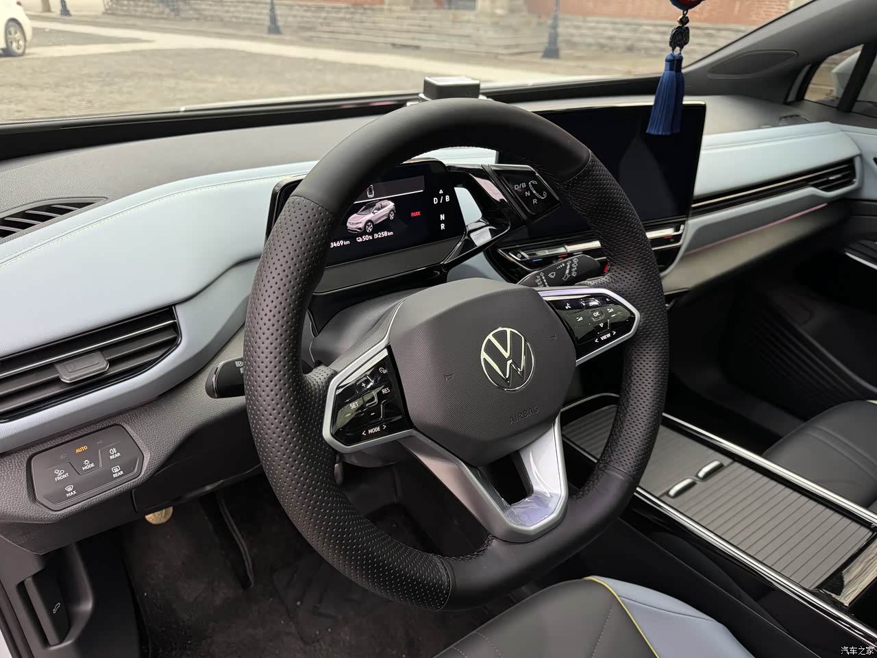 内饰方面仿皮质感的纹理,手感差一些,蓝黑色的搭配比较年轻时尚,晚上还有可调节好多种颜色的氛围灯,按照心情调节灯光颜色。主副驾驶电动座椅(比之前手动拧的方便多了),方向盘都是真皮材质,质感十足,简单来说,ID4的内饰就是简约,不简单。
