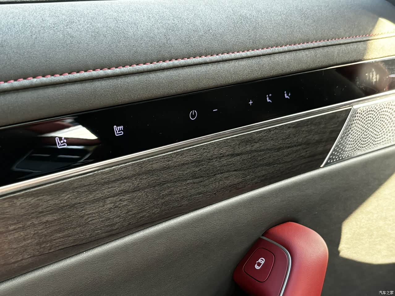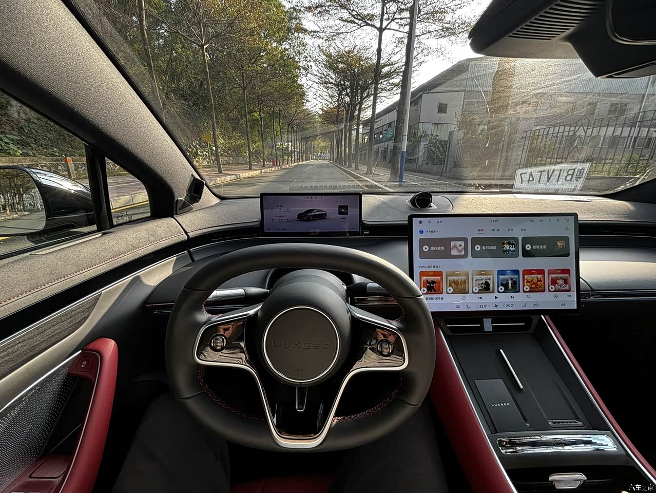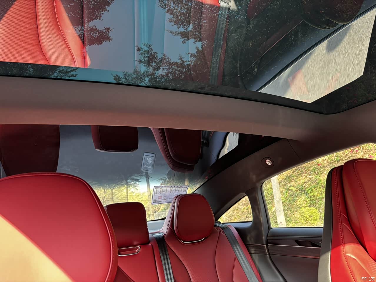我选的黑红内饰,运动感十足。整体内饰风格比较简约,方向盘比较有特点,官方名橄榄运动方向盘,比半幅方向盘好用很多。仪表屏也非常大,位置介于正常仪表屏位置与HUD之间,兼顾仪表屏与HUD作用,很巧妙。
