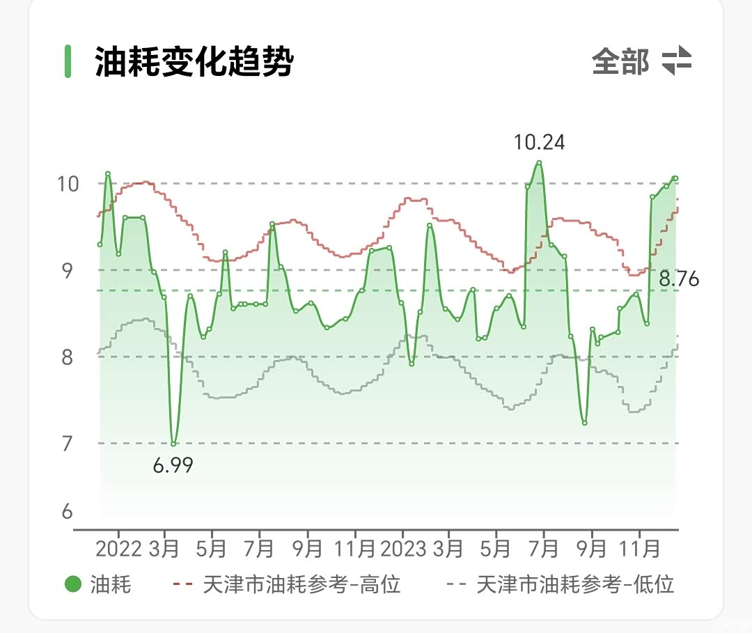 平时上下班代步用,一半在城区中心 比较堵的路段,一半在开发区除了红绿灯较顺。整体两年下来油耗应该算是稳定了,冬天夏天油耗偏高。表显冬夏季9L出头,春秋季8L。我自己用加油记录软件计算出来的夏季最多10L出头,春秋最低7L左右,一般8.3L左右