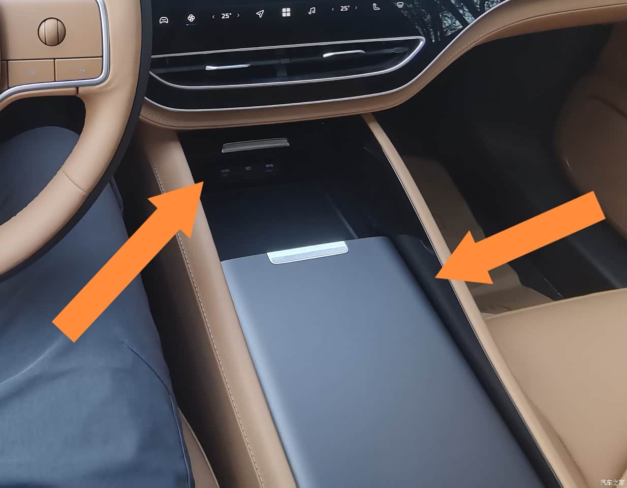 左边箭头指的地方是放手机,可以支持无线充电,盖子往前一推,会向后缓慢闭合,像电动的一样有点意思。右边箭头指的是放杯子的地方,往后翻盖掀开,2个圆是下沉式的水杯架