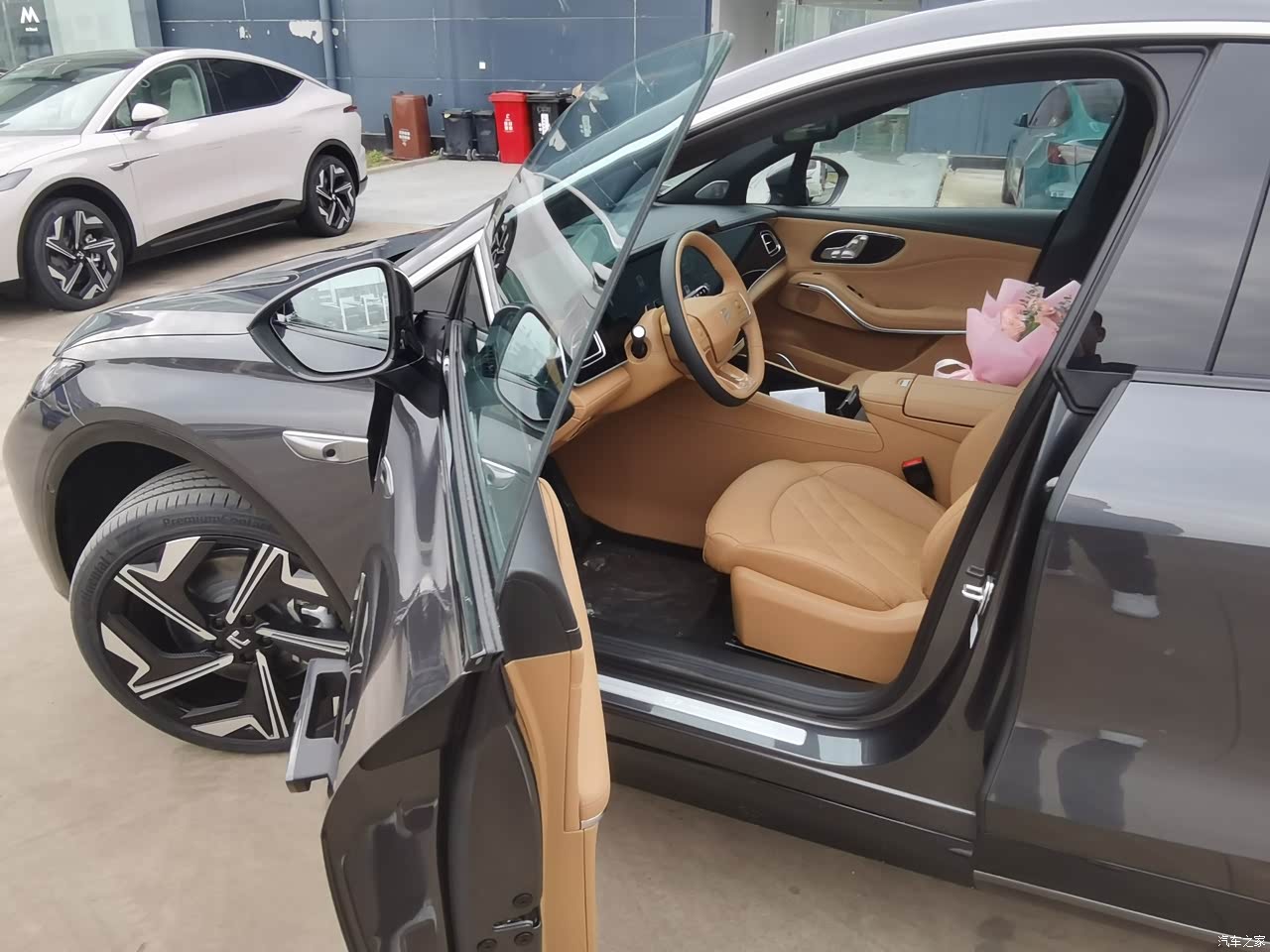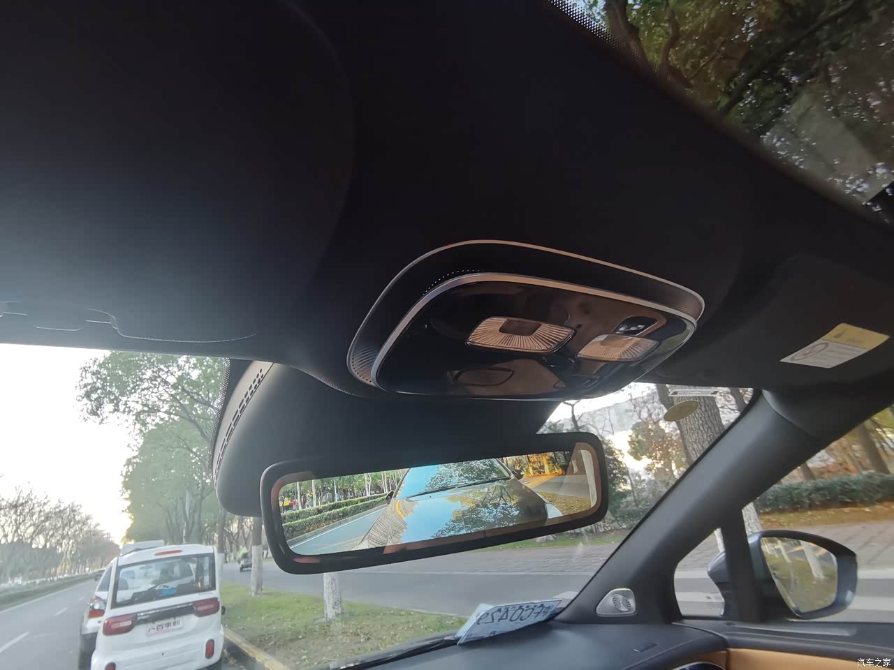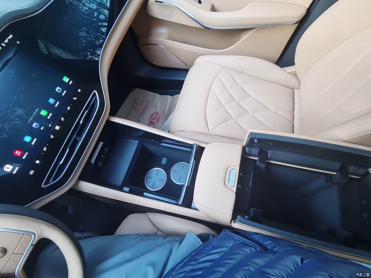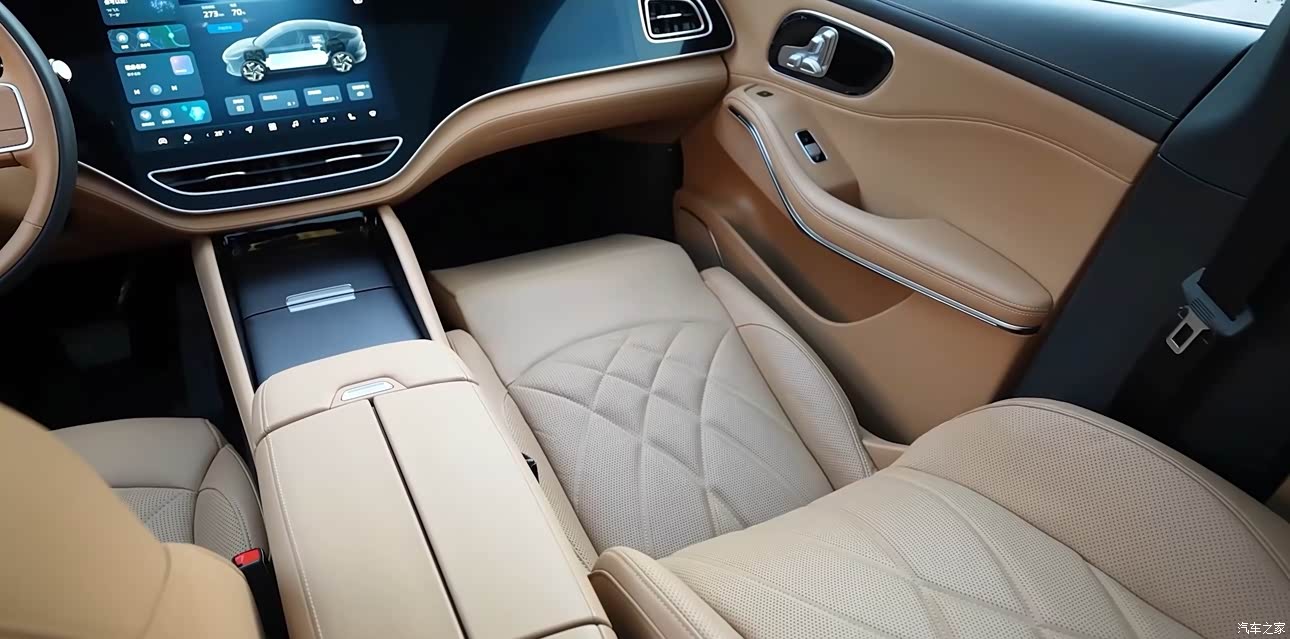 内饰棕色,座椅是软皮质的,带通风加热按摩,坐上去蛮舒服,加上隔音好,很享受,家人在外面边上说话都听不见。中间后视镜是视频的,可以关掉变成普通后视镜,但溜背的后窗视野会小,所以建议别关。车机超大三联屏,副驾老婆坐,单独副驾屏幕,副驾座椅带腿托,所以老婆一上车就是加热按摩躺下看剧