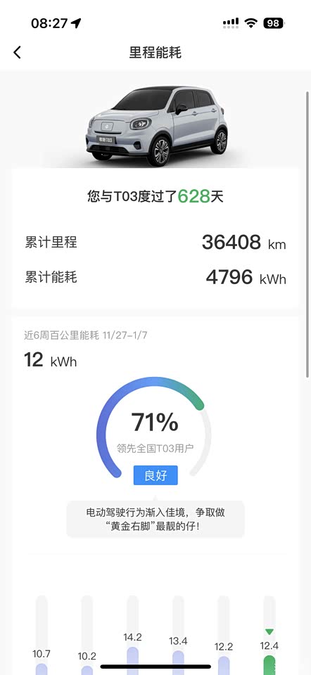 我的用车城市在江苏泰州,我买车主要是市里通勤和上下班,偶尔有出远门,403的续航足够用。上下班通勤30km左右,正常10天左右一充,家里有充电桩,所以没有续航焦虑。刚开始踩电门睬的轻,所以能耗相对于低一点,大概85折左右,上次几次高速,因为开的110码,续航大概55折左右。冬天的话大概打个6折左右,因为出门和下班都会提前开空调,所以能耗会高一些。