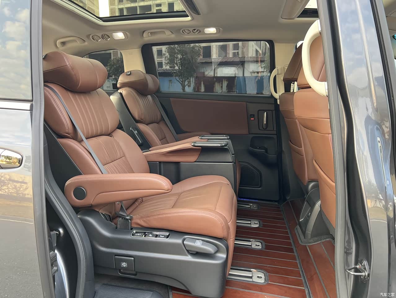 内饰的整体看着也是挺简洁的,坐在车内也挺舒服,座椅的皮质真的非常的好。舒适性的话是这款车的一个标签了,尤其是他中排座椅真的很棒,腿托竖起来的话,躺在上面很惬意。不过,在用料方面,有些地方还带有一点塑料感,但做工非常精细,细节处理得当。