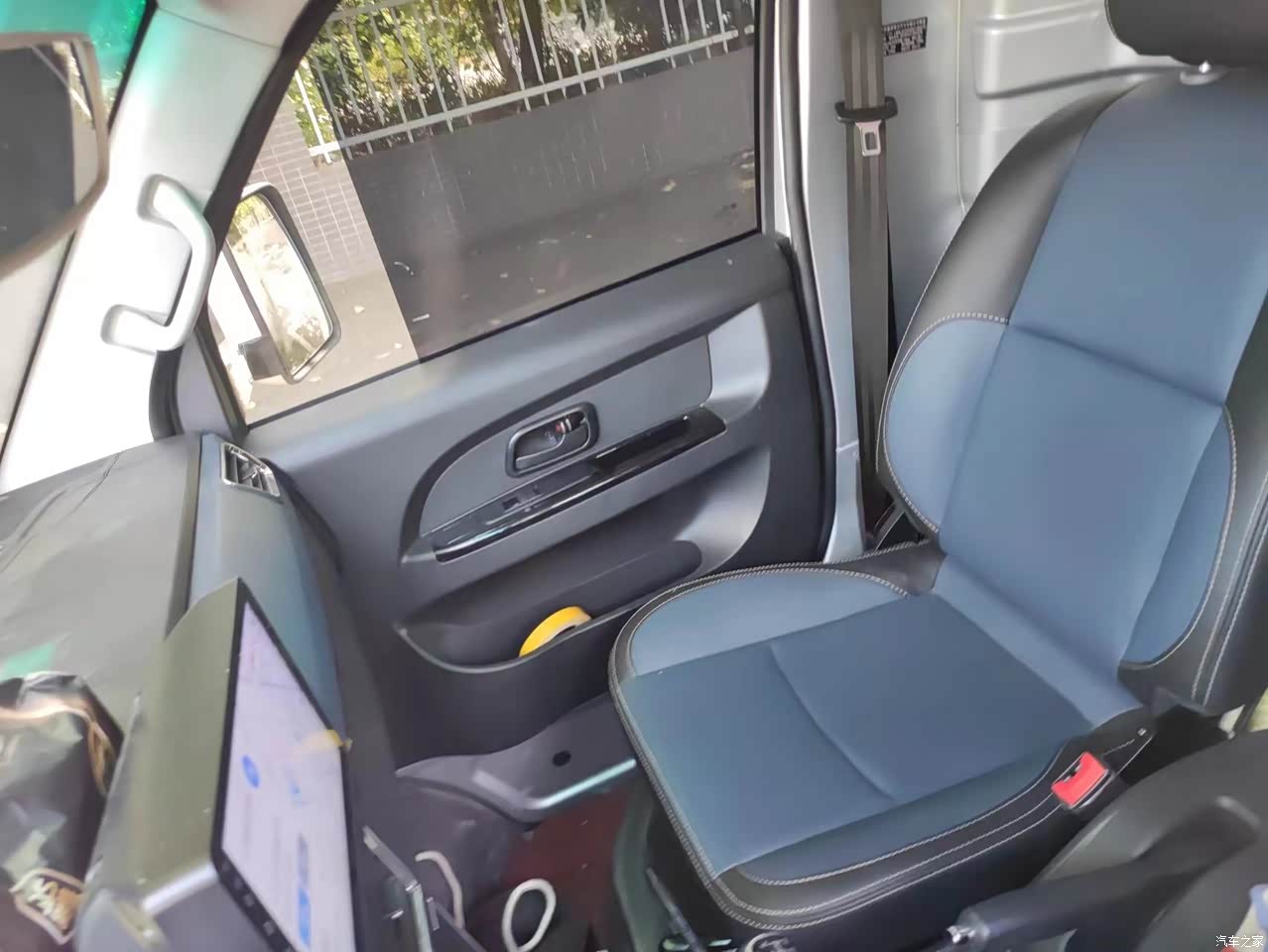 内饰在同样的货车里面看起来还算是挺高级的。包括仿皮质的座椅,货车还带有中控屏哦。空调出风口这些。手感也挺不错。新车都没有什么味道。虽然说是塑料的面板