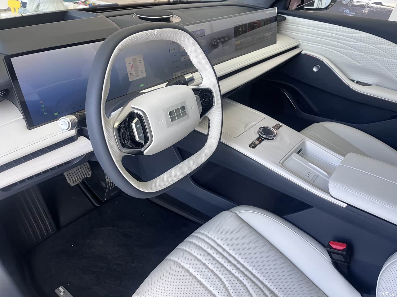 内饰部分最吸我们注意的是配备45英寸8K无界智慧霸屏,从驾驶位左侧一直延续到副驾右侧,几乎贯穿整个中控台,不得不佩服现在的国产车的内饰也是做的很豪华科技前卫!