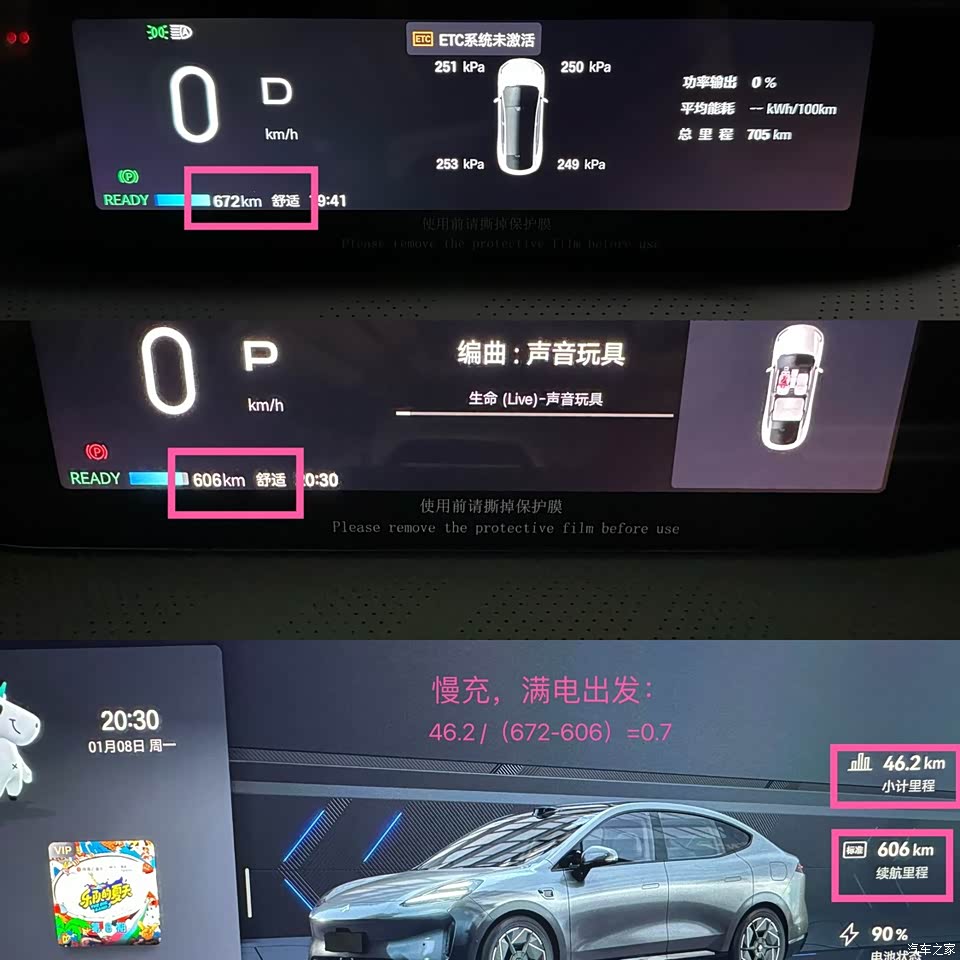 我在北京,昊铂HT这个车续航一般,跟上汽长安二汽,新势力的半斤八两水平,没有明显优势。 北京冬天的电动车,照着5-6折开,得有这个心理预期!这是前几天北京冷的时候跑的,慢充,匀速驾驶,电池保温(很重要)满电状态下出发,46.2/(672-606)=0.7,大概是打7折。 第二张图是快充,剧烈驾驶,所有用电器都打开,无电池保温,早晨零下,续航就有较大折扣,还不到6折。