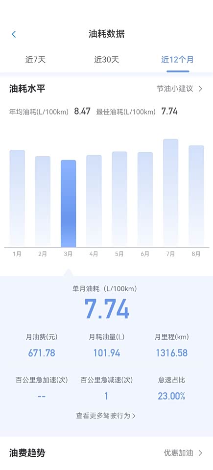 我开的路程基本一半市区一半郊区,每天来回60公里左右,平均的优惠基本维持在8.5左右,周六周末车少不到8个,油耗我觉得不高,毕竟这个车很大,远程启动以后在开的话油耗降不下来,现在是冬天,我开暖风不开空调,让我有点惊讶的油耗。上面附上我用安吉星的油耗指数,大家都说我的车油耗真的不错,对比这个油耗我还是比较满意的,跑高速的优惠基本都在7个左右,听说开的时间长了油耗会涨上去,不知道是不是真的。